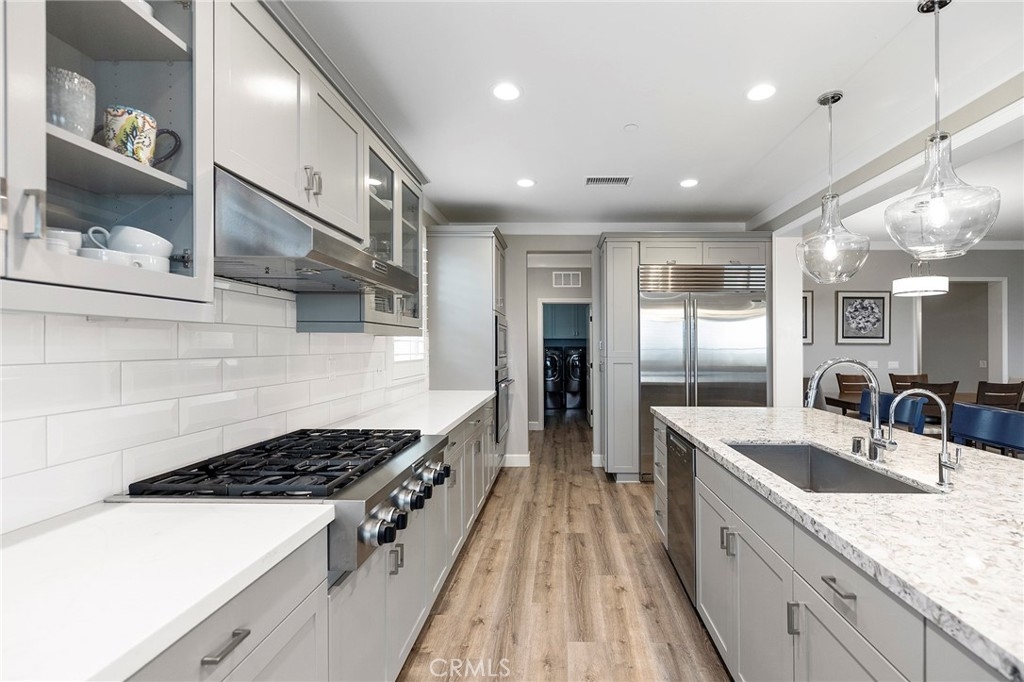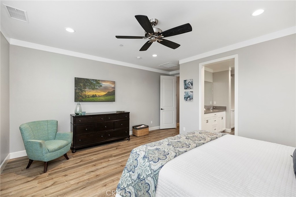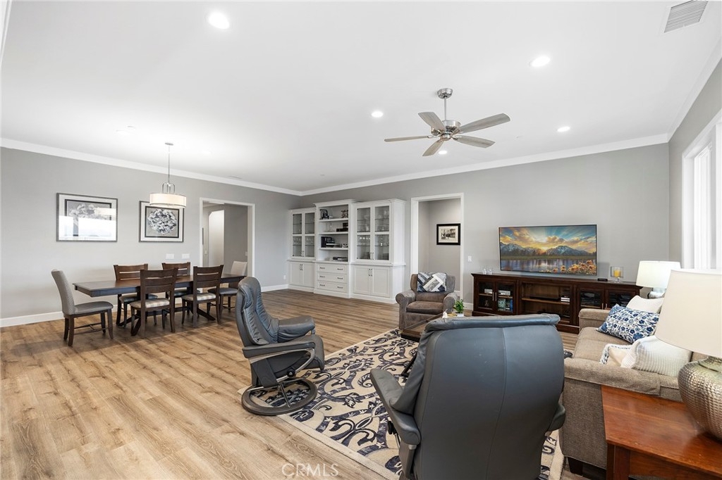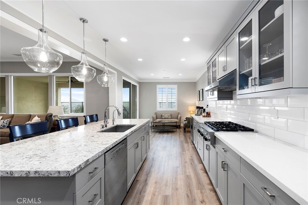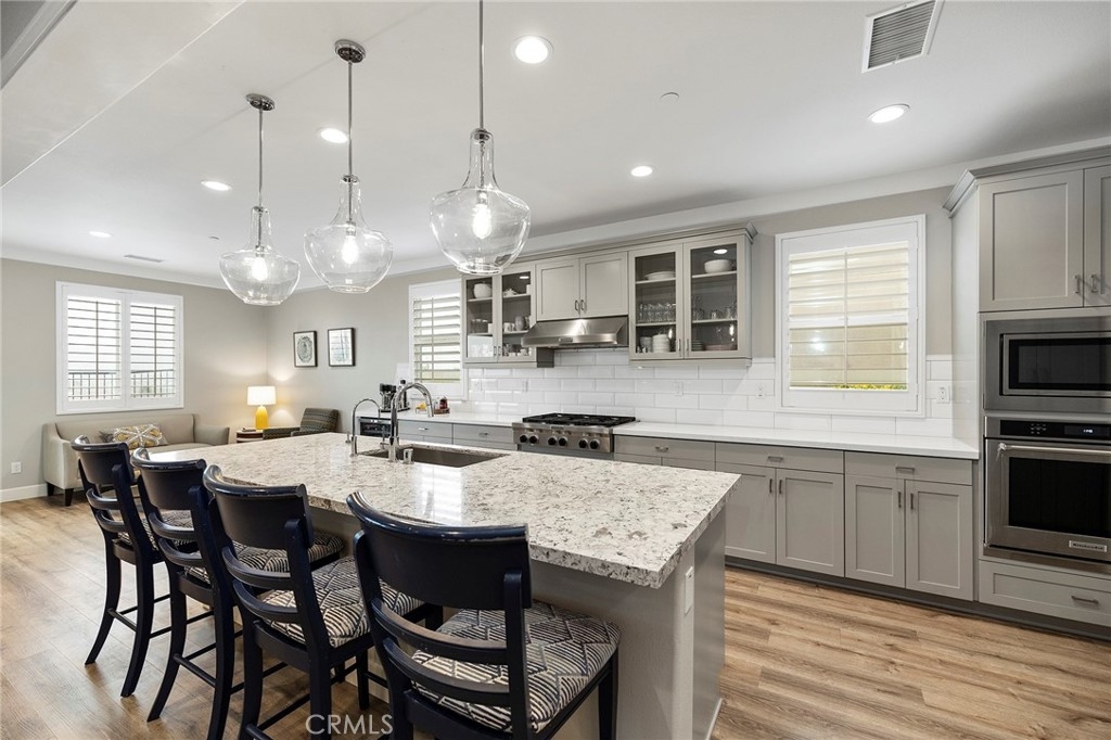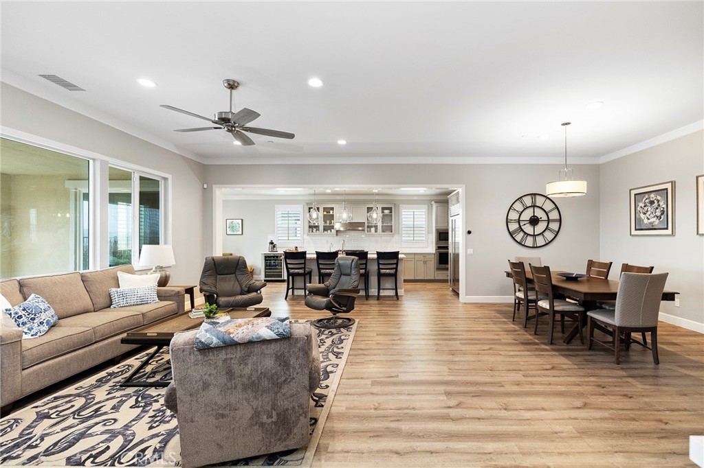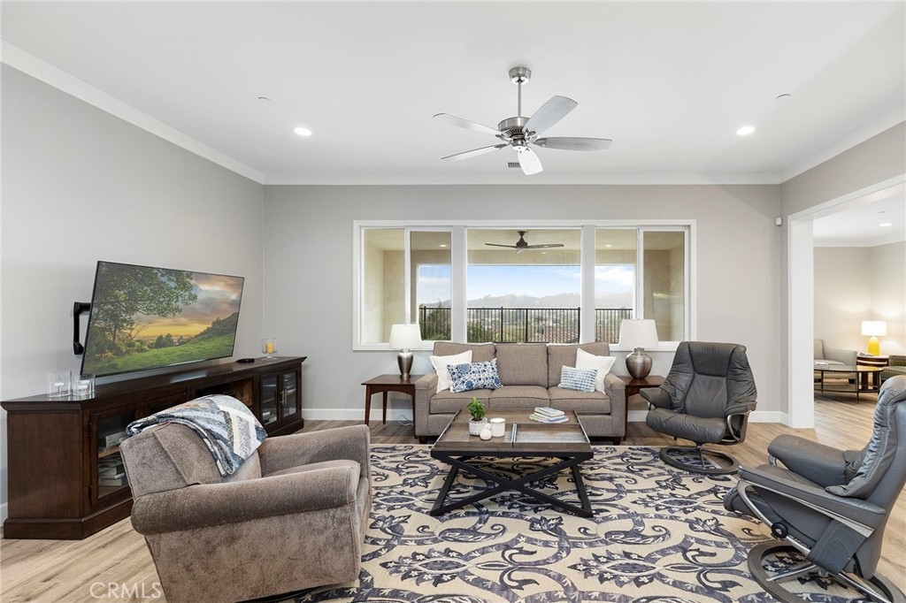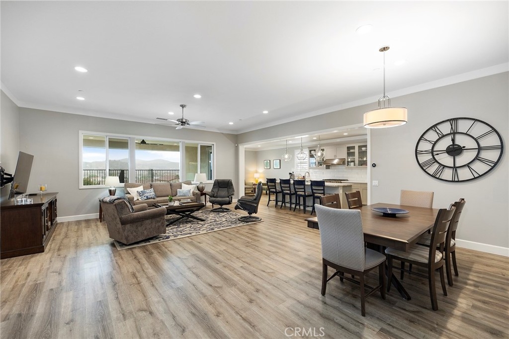 VIEWS! VIEWS!! VIEWS!!! Luxurious Single-Story Estate in Gated Province at Audie Murphy Ranch. Discover breathtaking panoramic mountain and city light views from this exquisitely designed 3,000 sq ft single-story residence in Menifee's most prestigious gated community. This spectacular 4-bedroom, 3-bathroom home features a flowing open concept floor plan where the gourmet chef's kitchen seamlessly overlooks an expansive family room and elegant dining area. Refined details include beautiful custom woodwork, soaring ceilings, recessed lighting, designer plantation shutters, crown molding, and premium luxury vinyl plank flooring. A versatile bonus space offers possibilities as a cozy kitchenette or sophisticated seating area. The sumptuous master retreat features an oversized bedroom suite with a spa-inspired bathroom including separate shower, soaking tub, and dual vanity. The space includes a built-in linen closet and impressive walk-in closet with custom built-ins. All secondary bedrooms feature walk-in closets and ceiling fans, with two sharing a well-appointed Jack-and-Jill bathroom. The kitchen is any chef's dream with professional-grade appliances including a SubZero built-in refrigerator with reverse osmosis, professional 6-burner gas cooktop, and premium Miele dishwasher. Enjoy custom shaker cabinets, a spacious walk-in pantry, and butler's pantry. The laundry room includes a refrigerator with reverse osmosis and wash sink. Stay comfortable with the energy-efficient QuietCool whole house fan system. The 3-car tandem garage features cabinet storage and epoxy flooring. Outside, meticulously landscaped grounds showcase mountain vistas, a tranquil fountain, glass-rock fireplace, and low-maintenance artificial turf. Ideally positioned between the 15 and 215 freeways with easy access to shopping and Province's resort-style amenities: pools, spas, sports courts, clubhouse, trails, and skate park.