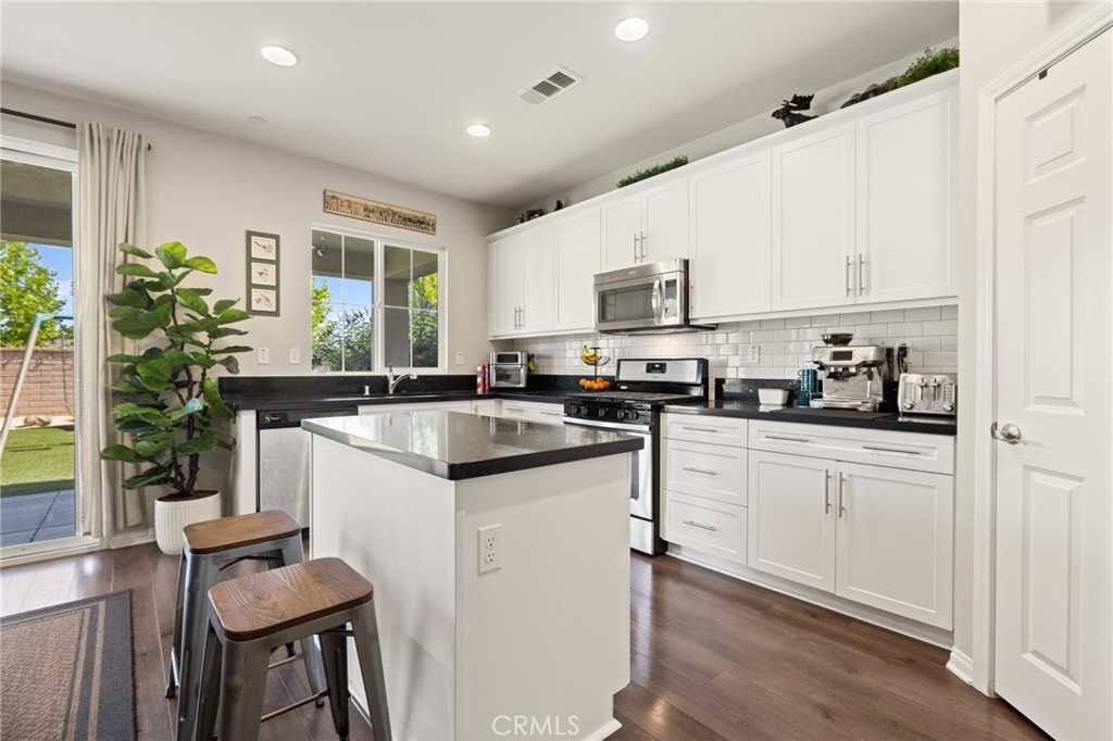 Looking for a single-story home sitting on the Salt Creek Trail with easy access to nature? Well, this is the one! This stunning single story offers just under 1500 sqft of living space with 3 bedrooms and 2 baths on a quiet street nestled on the creek side of the highly desirable community of Audie Murphy Ranch in Menifee. There was no stone unturned with this property and it shows through from the meticulously thought-out front landscaping featuring artificial turf with a large romantic mature tree offering tons of shade to the extra wide drive and owned solar featuring concrete steps leading the way to the quaint porch with mountain views. As you enter the ranch style property you are greeted by tall ceilings, recessed lighting, custom paint and LVP floors throughout with an open floor plan. The Great Room features large windows allowing tons of light to flood the home which flows into the dining area and gourmet kitchen. The kitchen is appointed with black quartz counters, subway tile backsplash, stainless steel appliances, walk-in pantry, and white cabinets with access to the 2-car garage. Down the hall is the large laundry room across from the beautiful master. The master bedroom features LVP floors, views of the private yard, a walk-in closet and attached bath boasting tile floors, shower tub combo, linen closet, and a dual vanity with quartz counters. The first secondary bedroom is being used as an office featuring a heather green accent wall, mirrored closet doors and is next to the last bedroom which is oversized and shareable also featuring mirrored closet doors. They share a secondary bath boasting a single vanity and shower tub combo. The pool size backyard is appointed with an extra-large CA room with recessed lighting, concrete for entertaining, artificial turf, mature trees and no rear neighbors. The community features pools, spas, sports courts, skate park, club house, hiking and biking trails, the award winning Taawila Elementary school and new Kathryn Newport Middle school, is super close to shopping and between the 15 and 215 freeways! The community is an hour to San Diego, the beaches, Palm Springs, Idyllwild, 2 hours to Big Bear and 20 minutes from the Temecula wineries.
