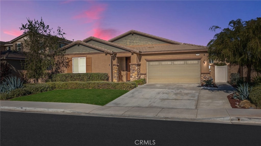 Welcome home to the best single story home available in the prestigious community of Audie Murphy Ranch in Menifee. The gorgeous three bedroom, three bath home features a bonus room perfect for a fourth bedroom, almost 2500 sqft of living space and a private lot perfect for entertaining, 3 car tandem garage and OWNED SOLAR. As you enter the home you are greeted by tall ceilings, recessed lighting, custom paint and a very desirable floor-plan. From the entrance of the home, you walk in greeted by a long hallway, and to the immediate left are the two secondary bedroom, which are large, featuring carpet, custom paint and share a jack and jill bath with tile floors, granite counters, and soaking tub shower combo. Adjacent to the rooms is access to the 3 car garage, large laundry room boasting a wash sink, custom tile backsplash and tons of storage. The flex room which can be a fourth bedroom is across from the laundry room and can be used as an office, dining room or whatever one sees fit. Off the flex room is an adorable powder room featuring a single vanity and tile floors. The rest of the home is open concept with a great room that is finished with a wood accent wall that open to the gourmet upgraded kitchen featuring tile floors, a double oven, stainless steel appliances, custom tile backsplash, a large kitchen island with eat up bar and granite counters and coffee colored cabinets offering tons of storage which offers a large eating nook perfect for a big dining table. The master suite is large with big windows that look out to the yard and attached master bath boasting tile floors, a soaking tub, standing shower, dual vanity and makeup area, and large walk-in closet. The yard is just off the great room and is private and is landscaped with lush grass, and is ready for it's new owners imagination. The community offers three pools, spas, sports courts, skate park, parks, hiking and biking trails, club house, and is in the Menifee Union School District, close to shopping and between the 15 and 215 freeways. This is a home you don't want to miss!