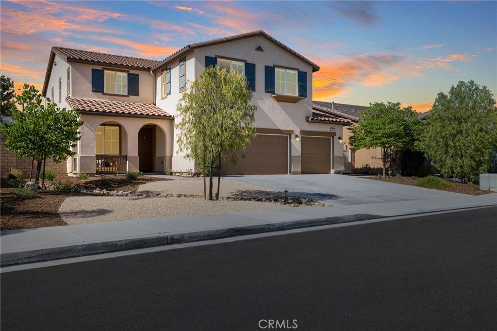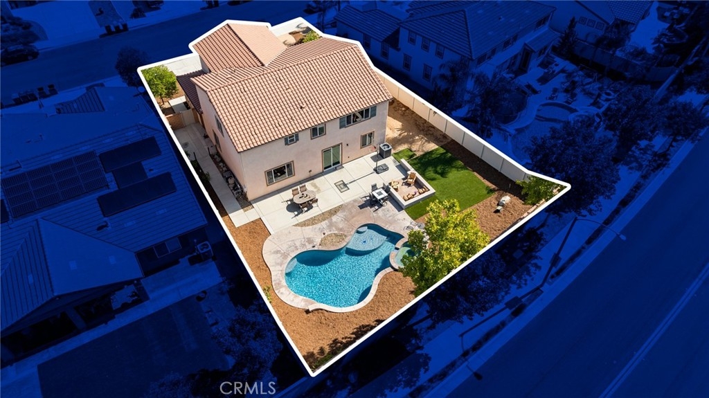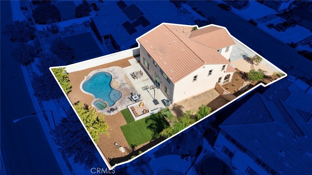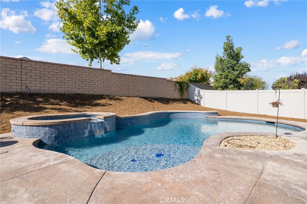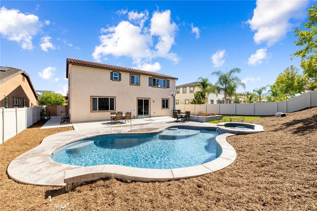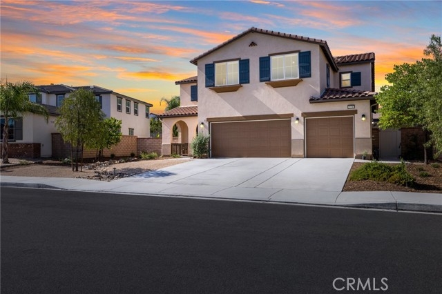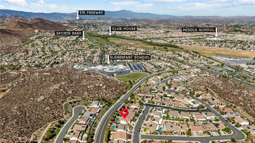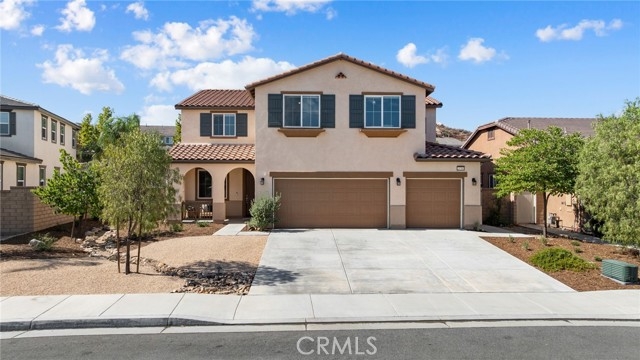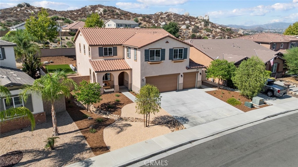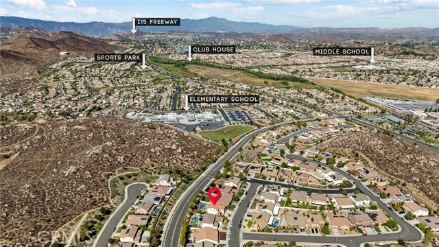 Welcome home to this amazing POOL home located in the prestigious community of Audie Murphy Ranch in Menifee. This exquisite 5 bedroom, 4 bath property offers almost 3500 sqft of living space featuring a loft, a main floor junior suite, 2 main floor bathrooms, 4 bedrooms upstairs, an oversized 9500 sqft lot, 3-car garage, mountain views and drought tolerant landscaping. Being in the Audie Murphy Ranch community this home is just steps away from the award winning Taawila Elementary school, close to trails, the skate park, sports park and within minutes to the freeway and tons of shopping. As you enter the home you are greeted by tall ceilings, recessed lighting, LVP floors, neutral paint and a very desirable floor plan. The Large dining room offers tons of light flooding in from the large windows and flows right into the butler’s pantry boasting granite counters and built-in cabinets situated across from the large walk-in pantry. The chef’s kitchen is appointed with granite counters, double ovens, 5 burner stove, and eat up island which faces the large eating area and right into the grand Great Room. The main floor offers a spacious junior suite boasting new carpet, a ceiling fan, standard closet and attached bath featuring a single vanity and walk-in shower. The second main floor bath is a powder room perfect for guests just off the entrance to the 3-car garage offering hookups for a soft water system. The second story boasts a massive loft, the three large secondary bedrooms, all featuring new carpet, gorgeous views and two of the three have walk-in closets. They all share a secondary bath boasting a dual vanity and shower tub combo. The oversized primary bedroom offers new carpet, a ceiling fan, tons of natural light, views of the yard and an attached bath boasting a dual vanity, seating area, soaking tub, shower and large walk-in closet. The 9500sqft entertainers dream yard features concrete for entertaining, a saltwater pool with baja step, built-in spa, large area with artificial turf, a built-in seating area perfect for a fire pit and tons of space to continue building your dream yard. The community also features pools, spa, club house, meeting and banquet rooms and the new Kathryn Newport Middle school. The home is located between the 15 and 215 freeways, 20 minutes from the Temecula Wineries, an hour to San Diego, Orange County and LA. This is a home you do not want to miss!