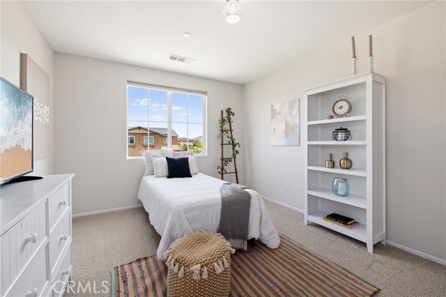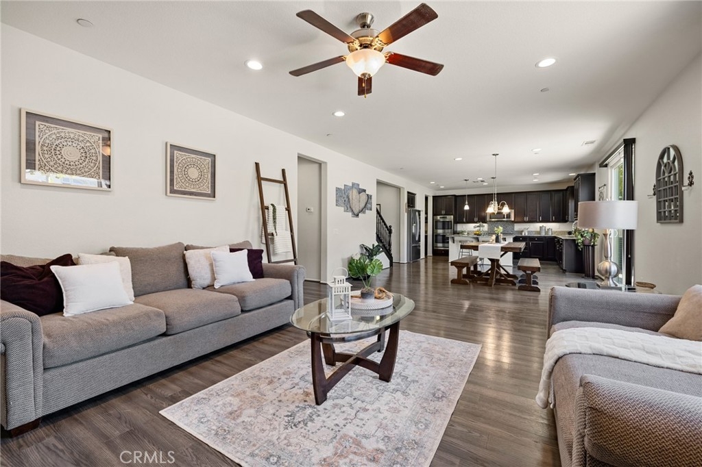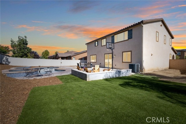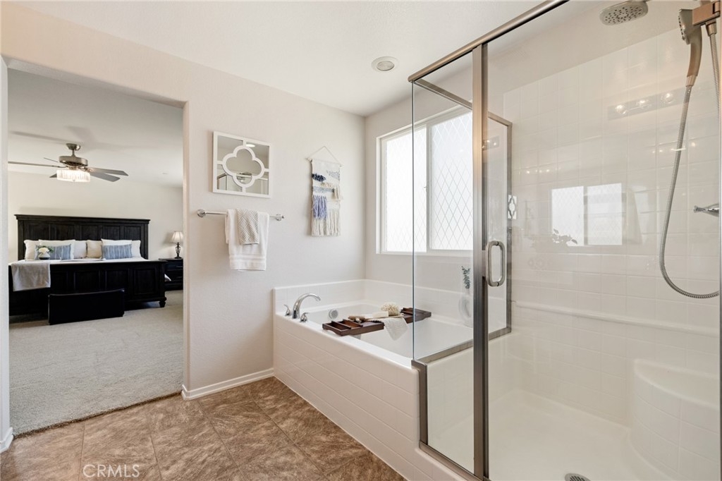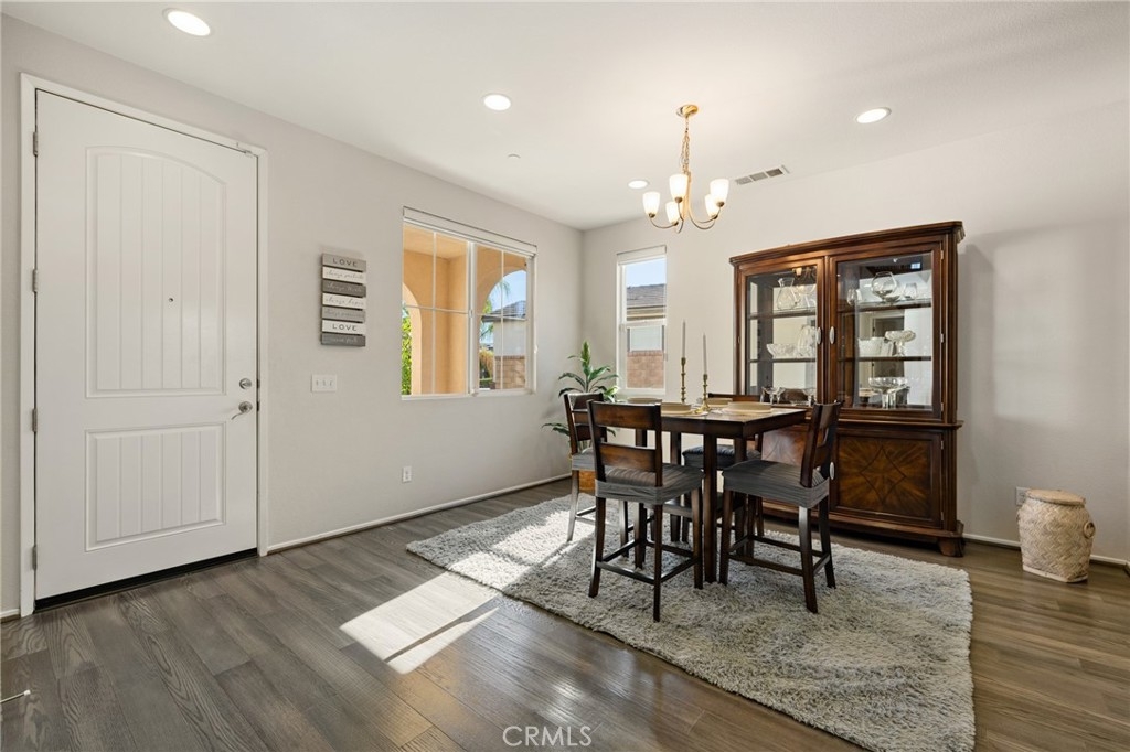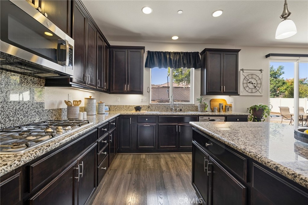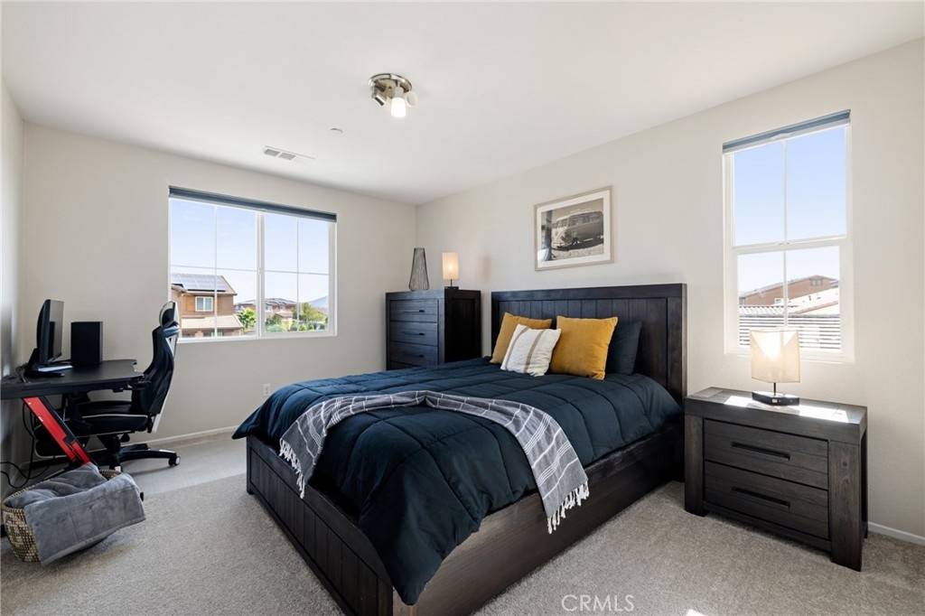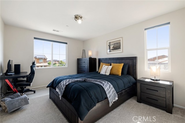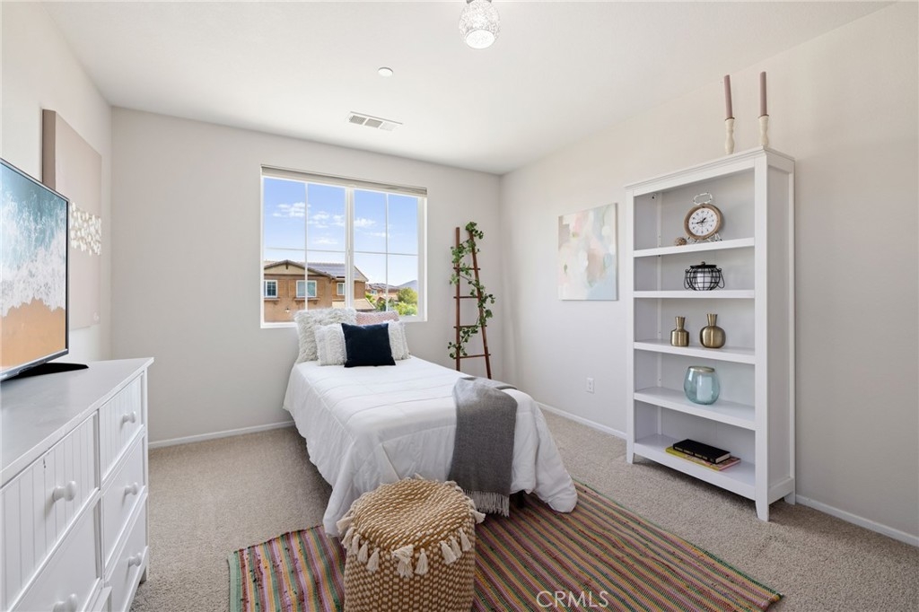 Welcome home to this amazing POOL home located in the prestigious community of Audie Murphy Ranch in Menifee. This exquisite 5 bedroom, 4 bath property offers almost 3500 sqft of living space featuring a loft, a main floor junior suite, 2 main floor bathrooms, 4 bedrooms upstairs, an oversized 9500 sqft lot, 3-car garage, mountain views and drought tolerant landscaping. Being in the Audie Murphy Ranch community this home is just steps away from the award winning Taawila Elementary school, close to trails, the skate park, sports park and within minutes to the freeway and tons of shopping. As you enter the home you are greeted by tall ceilings, recessed lighting, LVP floors, neutral paint and a very desirable floor plan. The Large dining room offers tons of light flooding in from the large windows and flows right into the butler’s pantry boasting granite counters and built-in cabinets situated across from the large walk-in pantry. The chef’s kitchen is appointed with granite counters, double ovens, 5 burner stove, and eat up island which faces the large eating area and right into the grand Great Room. The main floor offers a spacious junior suite boasting new carpet, a ceiling fan, standard closet and attached bath featuring a single vanity and walk-in shower. The second main floor bath is a powder room perfect for guests just off the entrance to the 3-car garage offering hookups for a soft water system. The second story boasts a massive loft, the three large secondary bedrooms, all featuring new carpet, gorgeous views and two of the three have walk-in closets. They all share a secondary bath boasting a dual vanity and shower tub combo. The oversized primary bedroom offers new carpet, a ceiling fan, tons of natural light, views of the yard and an attached bath boasting a dual vanity, seating area, soaking tub, shower and large walk-in closet. The 9500sqft entertainers dream yard features concrete for entertaining, a saltwater pool with baja step, built-in spa, large area with artificial turf, a built-in seating area perfect for a fire pit and tons of space to continue building your dream yard. The community also features pools, spa, club house, meeting and banquet rooms and the new Kathryn Newport Middle school. The home is located between the 15 and 215 freeways, 20 minutes from the Temecula Wineries, an hour to San Diego, Orange County and LA. This is a home you do not want to miss!