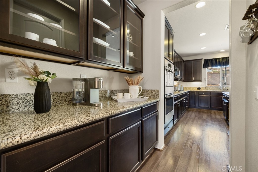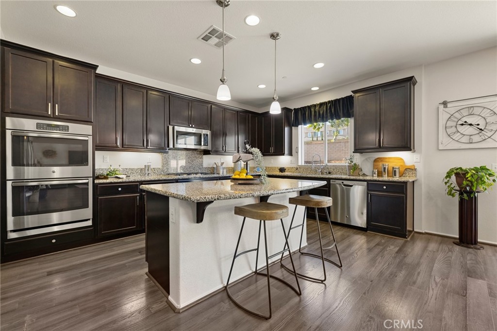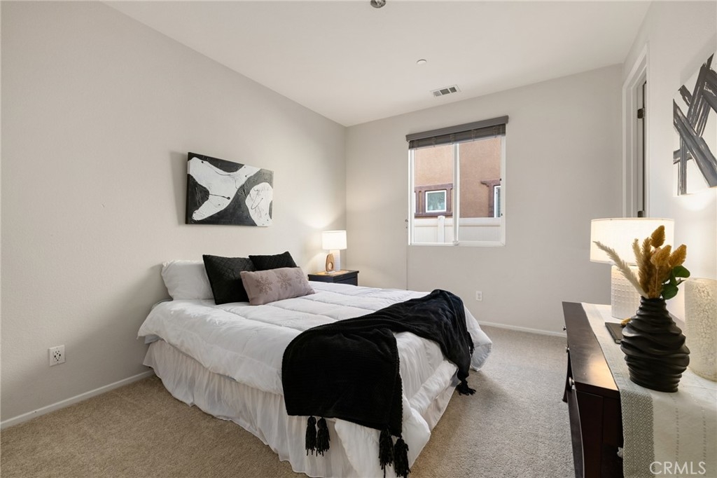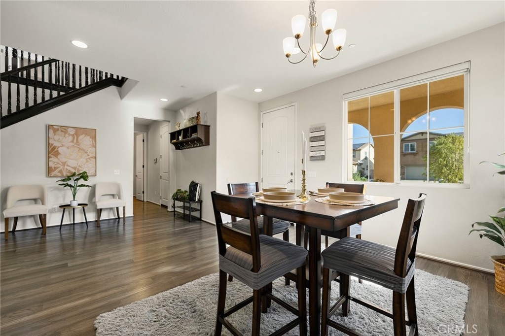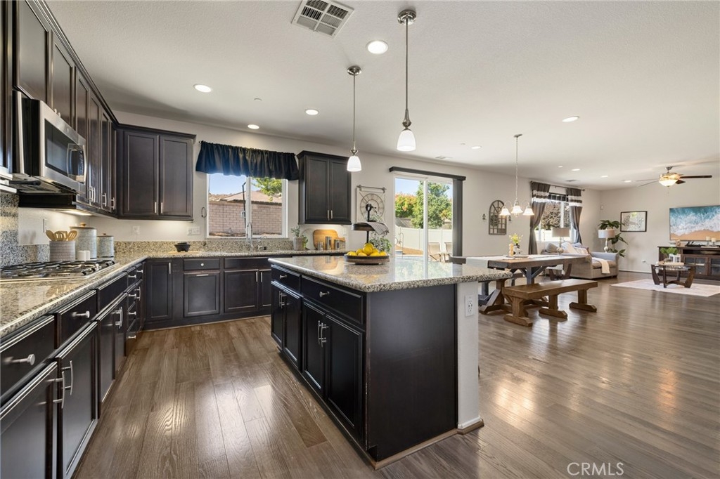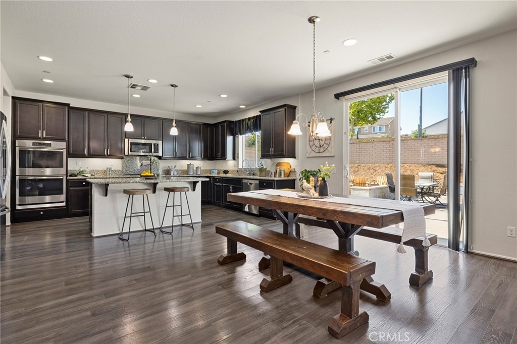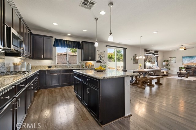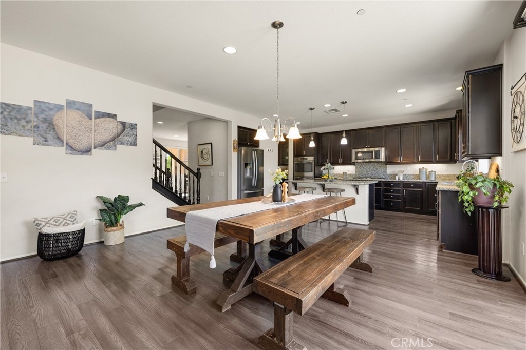 Welcome home to this amazing POOL home located in the prestigious community of Audie Murphy Ranch in Menifee. This exquisite 5 bedroom, 4 bath property offers almost 3500 sqft of living space featuring a loft, a main floor junior suite, 2 main floor bathrooms, 4 bedrooms upstairs, an oversized 9500 sqft lot, 3-car garage, mountain views and drought tolerant landscaping. Being in the Audie Murphy Ranch community this home is just steps away from the award winning Taawila Elementary school, close to trails, the skate park, sports park and within minutes to the freeway and tons of shopping. As you enter the home you are greeted by tall ceilings, recessed lighting, LVP floors, neutral paint and a very desirable floor plan. The Large dining room offers tons of light flooding in from the large windows and flows right into the butler’s pantry boasting granite counters and built-in cabinets situated across from the large walk-in pantry. The chef’s kitchen is appointed with granite counters, double ovens, 5 burner stove, and eat up island which faces the large eating area and right into the grand Great Room. The main floor offers a spacious junior suite boasting new carpet, a ceiling fan, standard closet and attached bath featuring a single vanity and walk-in shower. The second main floor bath is a powder room perfect for guests just off the entrance to the 3-car garage offering hookups for a soft water system. The second story boasts a massive loft, the three large secondary bedrooms, all featuring new carpet, gorgeous views and two of the three have walk-in closets. They all share a secondary bath boasting a dual vanity and shower tub combo. The oversized primary bedroom offers new carpet, a ceiling fan, tons of natural light, views of the yard and an attached bath boasting a dual vanity, seating area, soaking tub, shower and large walk-in closet. The 9500sqft entertainers dream yard features concrete for entertaining, a saltwater pool with baja step, built-in spa, large area with artificial turf, a built-in seating area perfect for a fire pit and tons of space to continue building your dream yard. The community also features pools, spa, club house, meeting and banquet rooms and the new Kathryn Newport Middle school. The home is located between the 15 and 215 freeways, 20 minutes from the Temecula Wineries, an hour to San Diego, Orange County and LA. This is a home you do not want to miss!