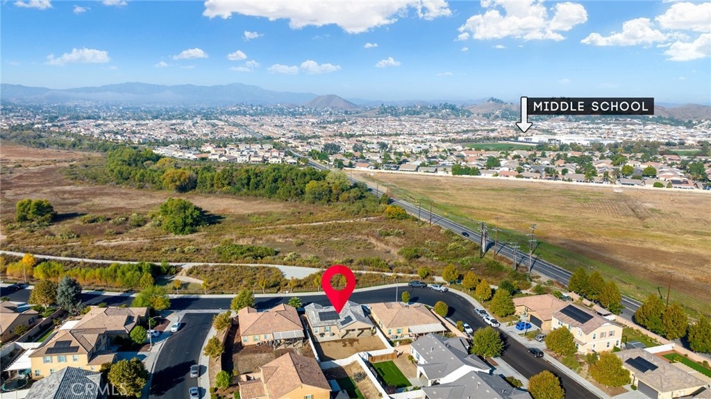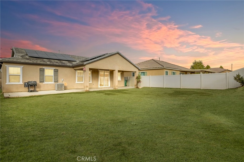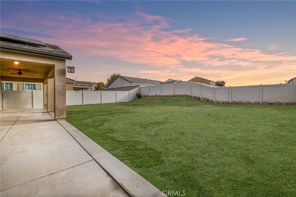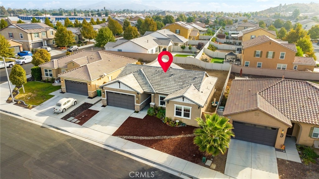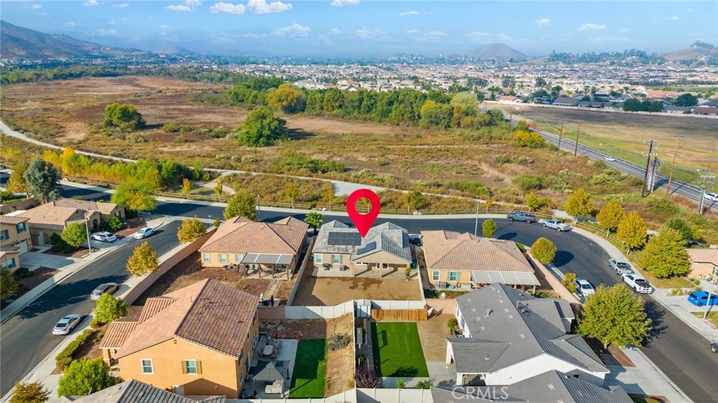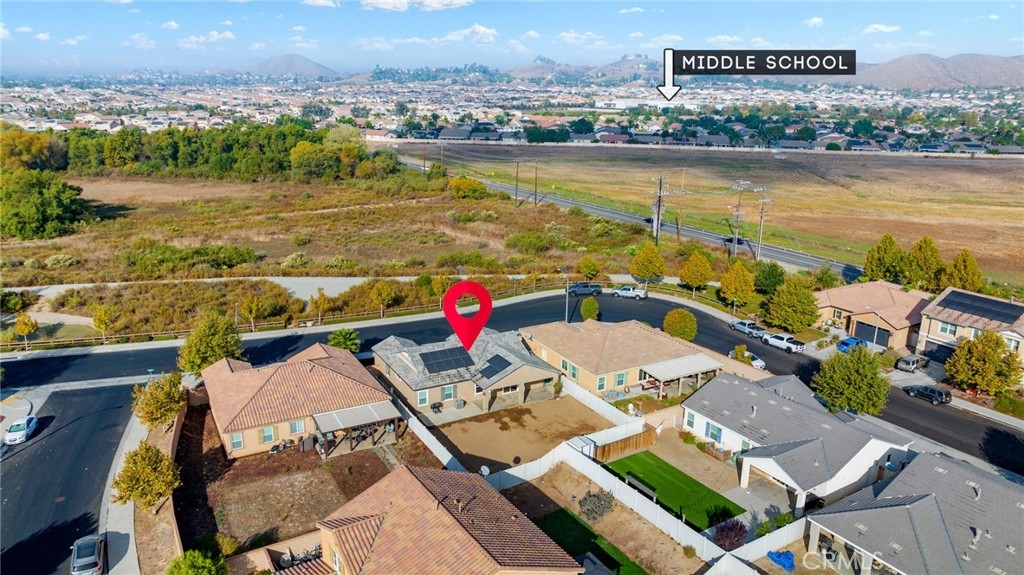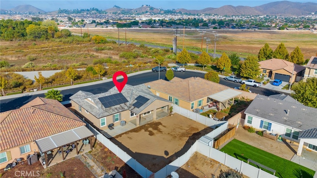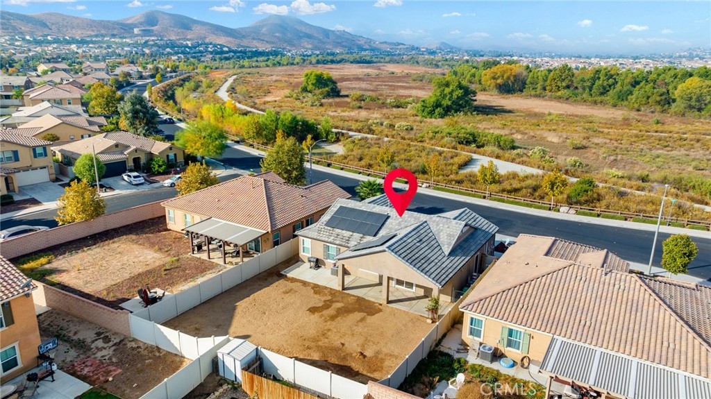 Welcome home to the most inviting single story home available in Audie Murphy Ranch in Menifee featuring a POOL SIZED LOT and OWNED SOLAR. The property is located right across from the amazing Salt Creek Reserve which features the communities hiking and biking trails, and centrally located between both the Elementary and Middle school with easy access for walking. As you enter the 3-bedroom 2 bath property you are greeted by brand new neutral interior paint, high white baseboards, tile floors throughout, recessed lighting and an open floor plan making the 1500sqft home feel spacious and inviting! The Great room has large windows allowing tons of natural light to flood the home and has enough space to add a fireplace and the decor of your dreams! The gorgeous kitchen is appointed with granite counters, white cabinets, stainless steel appliances, and a walk-in pantry with access to the 2-car garage. The amazing floor plan features 3 spacious bedrooms, of which the two secondary bedrooms face the front of the home with LVP floors, mirrored closets with large windows allowing tons of natural light to flood the rooms. The two share a secondary bath featuring a single vanity with quartz counters, shower/tub combo and tile floors. Down the hall is the spacious laundry room boasting storage and a wash sink. The gorgeous master boasts LVP floors, large windows, a walk-in closet, and an attached bath featuring tile floors, dual quartz counter vanity, linen closet, walk-in super shower, and a walk-in closet. The entertainer’s yard is large enough to build your dream pool, or an amazing yard sure to wow the neighbors! It's a blank slate ready to be transformed into the yard of your dreams with a built-in large California Room featuring recessed lighting and a ceiling fan with concrete surrounding the back and side yards with dog runs ready to go! The community features pools, spa, sport courts, hiking and biking trails, skate park, club house, meeting and banquet rooms, with the award winning Taawila Elementary school and brand-new Kathryn Newport Middle school, super close to shopping and in between the 15 and 215 freeways. DO NOT MISS THIS ONE!