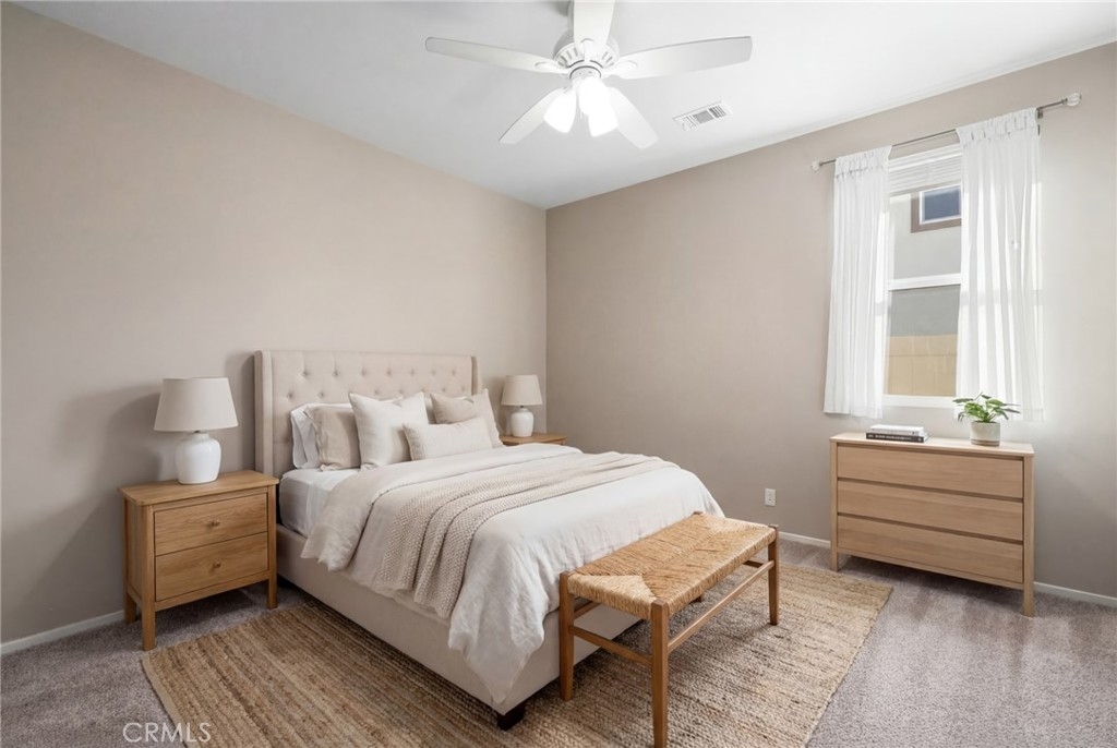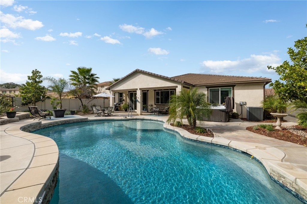 No rear neighbors, mountain views, pool and above ground spa, on a cul-de-sac, with owned solar, say no more! This ranch style home is the highly sought after Julia floor plan built by Richmond American in the premier community of Audie Murphy Ranch, in Menifee. Offering 3 bedrooms, an office, a den, 2.5 baths, 2 CA rooms and a 3-car tandem garage. The 2800 sqft home sits on a 1/4-acre view lot and is located directly across from the award winning Taawila ES, and Spirit Park. As you step inside you are welcomed by tall ceilings, neutral paint, LVP floors and recessed lighting throughout. The entrance brings you to the first two large secondary bedrooms offering plush carpet, custom blinds, walk-in closets and share a Jack and Jill bath with separate sinks and a tub shower combo. On this wing of the home is also the large laundry room boasting a wash sink, storage and folding counter. Across the hall offers access to the three-car garage and a powder bath that is across from the grand den. This formal sitting room can easily be a 4th bedroom and boasts custom light blue paint, plush carpet and a sliding glass door to a CA Room offering the perfect sitting area and custom heavy duty electric shade to the floor. The open floor plan features a large Great Room with tons of light flooding the home from multiple windows upgraded with dark plantation shutters. The gourmet kitchen features an extra-long eat up island with granite counters, stainless steel appliances including a double oven, built-in cook top, custom pendant lighting and tons of storage and counter space. Through the kitchen is the prep-kitchen boasting a sink, more storage and access into the oversized walk-in pantry. Just off the Great Room is a large dining area with access into an open-air office featuring a built-in desk with space for two! The primary suite offers carpet, custom blinds and a gorgeous, attached bath boasting tile floors, custom ceramic tiled shower and soaking tub, two separate sinks and large walk-in closet. Step through a double slider into your private oasis boasting a large CA room, tons of fruit trees ranging from lemons, apricots, plums and more to a tropical side yard and custom salt water, pebble tech pool with water falls and above ground spa facing the mountain side. The community features pools, spa, sports courts, skate park, club house and various trails and the new Kathryn Newport Middle school. Located between the 15 and 215 freeways and tons of shopping!