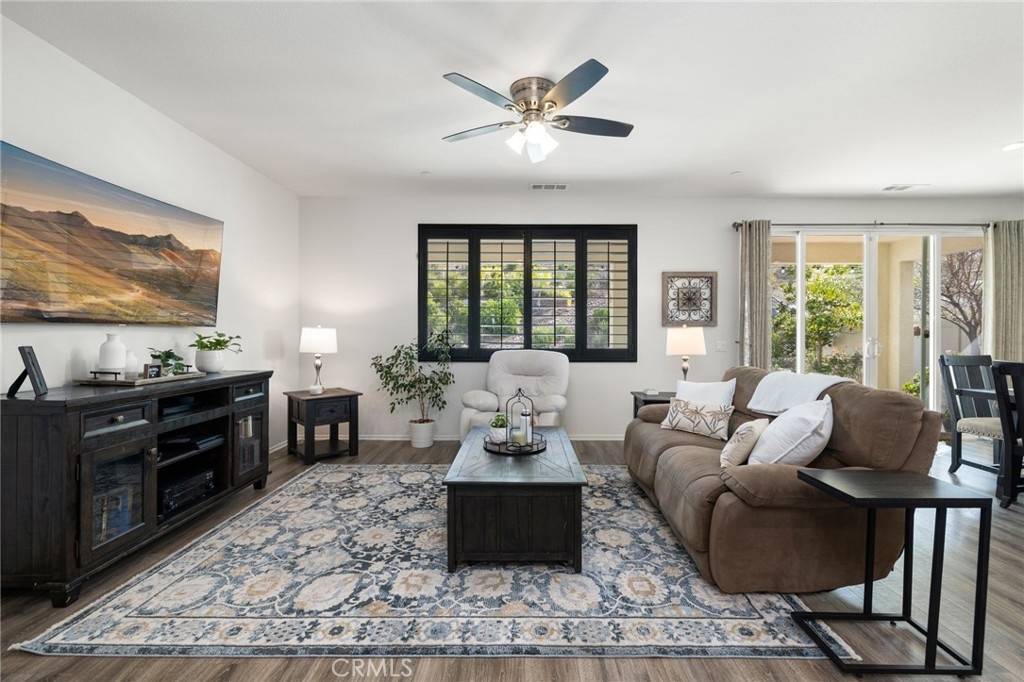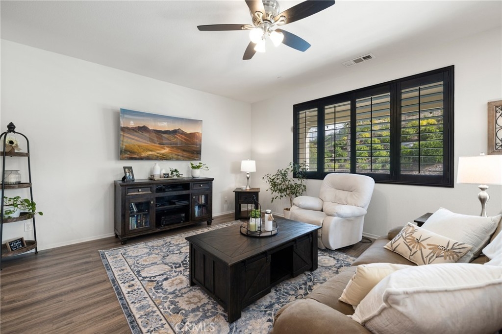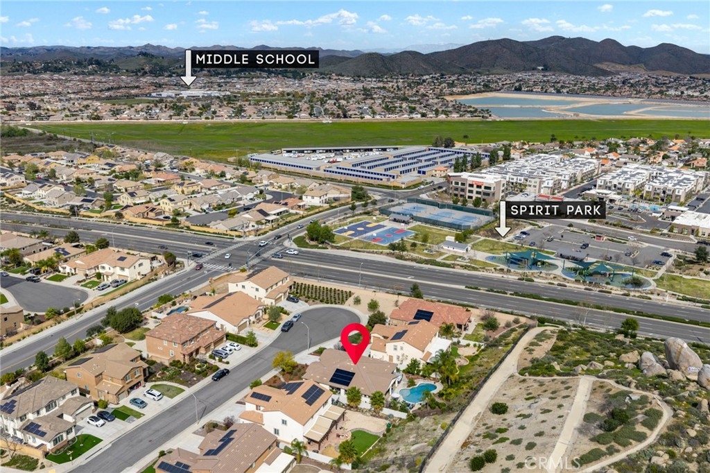 No rear neighbors, mountain views, pool and above ground spa, on a cul-de-sac, with owned solar, say no more! This ranch style home is the highly sought after Julia floor plan built by Richmond American in the premier community of Audie Murphy Ranch, in Menifee. Offering 3 bedrooms, an office, a den, 2.5 baths, 2 CA rooms and a 3-car tandem garage. The 2800 sqft home sits on a 1/4-acre view lot and is located directly across from the award winning Taawila ES, and Spirit Park. As you step inside you are welcomed by tall ceilings, neutral paint, LVP floors and recessed lighting throughout. The entrance brings you to the first two large secondary bedrooms offering plush carpet, custom blinds, walk-in closets and share a Jack and Jill bath with separate sinks and a tub shower combo. On this wing of the home is also the large laundry room boasting a wash sink, storage and folding counter. Across the hall offers access to the three-car garage and a powder bath that is across from the grand den. This formal sitting room can easily be a 4th bedroom and boasts custom light blue paint, plush carpet and a sliding glass door to a CA Room offering the perfect sitting area and custom heavy duty electric shade to the floor. The open floor plan features a large Great Room with tons of light flooding the home from multiple windows upgraded with dark plantation shutters. The gourmet kitchen features an extra-long eat up island with granite counters, stainless steel appliances including a double oven, built-in cook top, custom pendant lighting and tons of storage and counter space. Through the kitchen is the prep-kitchen boasting a sink, more storage and access into the oversized walk-in pantry. Just off the Great Room is a large dining area with access into an open-air office featuring a built-in desk with space for two! The primary suite offers carpet, custom blinds and a gorgeous, attached bath boasting tile floors, custom ceramic tiled shower and soaking tub, two separate sinks and large walk-in closet. Step through a double slider into your private oasis boasting a large CA room, tons of fruit trees ranging from lemons, apricots, plums and more to a tropical side yard and custom salt water, pebble tech pool with water falls and above ground spa facing the mountain side. The community features pools, spa, sports courts, skate park, club house and various trails and the new Kathryn Newport Middle school. Located between the 15 and 215 freeways and tons of shopping!