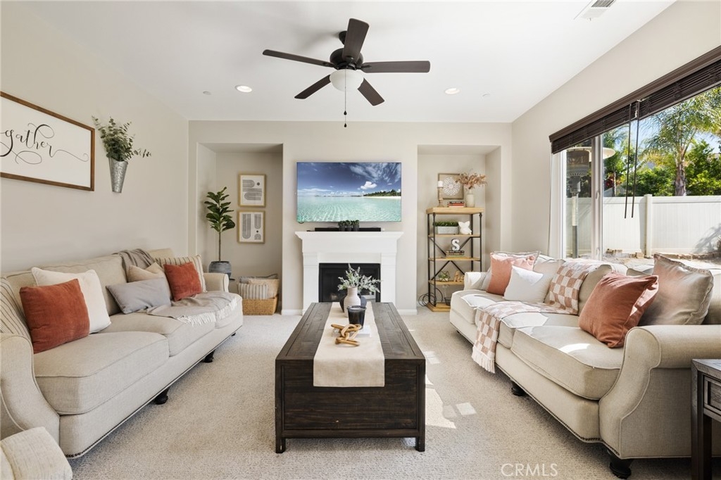 Immerse yourself in the serenity and beauty of this remarkable home, designed for pure enjoyment. This stunning 4 bedroom, 3 bath property offers over 2600 sqft of living space and is located in the premier community of Audie Murphy Ranch, in Menifee. As you enter the light and airy home you are greeted by tall ceilings, recessed lighting, LVP floors, custom paint, and an amazing floor plan. The entry way is upgraded with a custom wood wall and crown molding that leads the way to the spacious office. The office features French doors, an accent wall, crown molding and would be the perfect 4th bedroom. Off the office is a powder bath boasting a custom tile floor with enough room to add a shower. The open floor plan boasts 30-foot ceilings, a large dining room that flows into the gourmet kitchen and features a horseshoe kitchen island with eat up bar, granite counters, stainless steel appliances which include an oven as well as a convection microwave and tons of cabinets for storage. The large family room is appointed with upgraded carpet, large windows that allow tons of natural light, an electric fireplace and is ready for built-ins or bookshelves. The second story has gorgeous views down to the first floor and features a loft, upgraded carpet and mountain views. The upstairs also features two spacious secondary bedrooms that feature carpet, custom paint and one with a walk-in closet and chandelier as well as a window seat and the other features a ceiling fan and standard closet. The two rooms share a secondary bath boasting ceramic tile floors, a dual vanity with updated black fixtures and a tub, shower combo. The large master suite has stunning views and is very light and bright with a large, attached bath featuring tile floors, dual vanity, soaking tub and large walk-in closet. The 8200 sqft entertainers yard boasts a large CA room with recessed lighting, concrete that spans from both sides of the home making a great entertaining space and brand-new lush grass. The pool size lot is a perfect blank slate to build your dream yard and is ready for your landscaping dreams to come true! The home also features owned solar, a 3-car tandem garage with its own AC split and two huge side yards perfect for dog runs. The community features pools, spa, sports courts, hiking and biking trails, club house, skate park, the award winning Taawila ES, Kathryn Newport MS and is close to shopping, is between the 15 and 215 FWYS, & 20 minutes from the wineries.