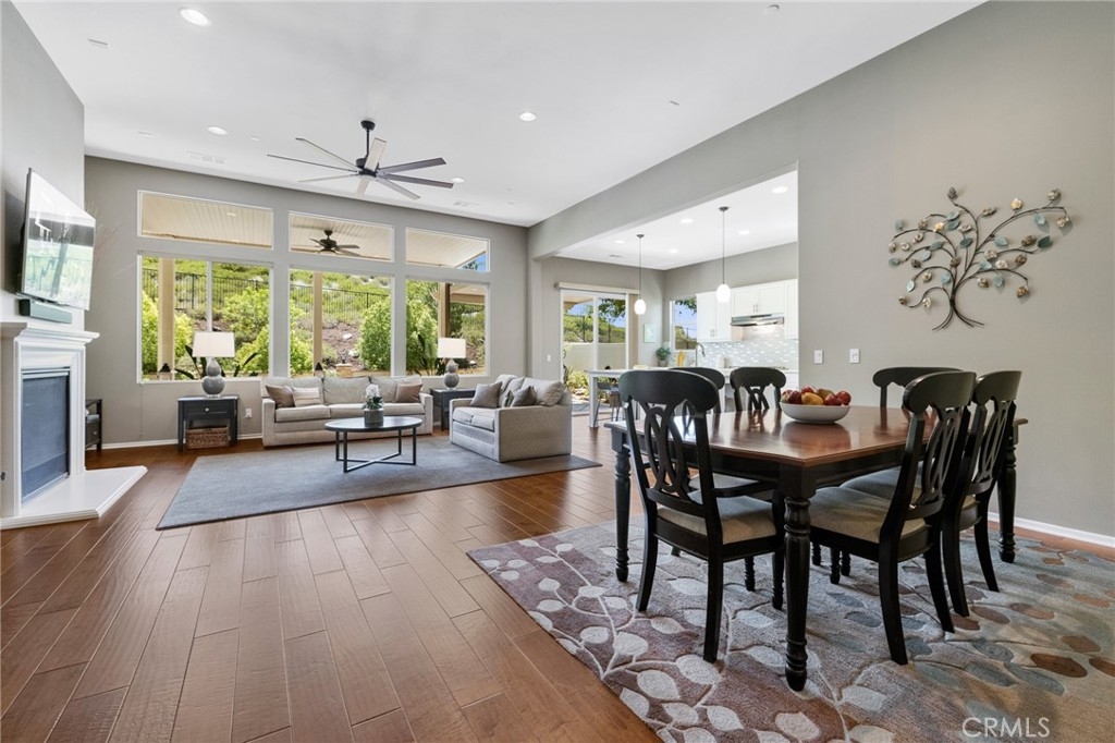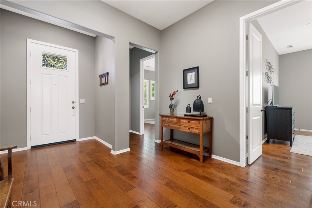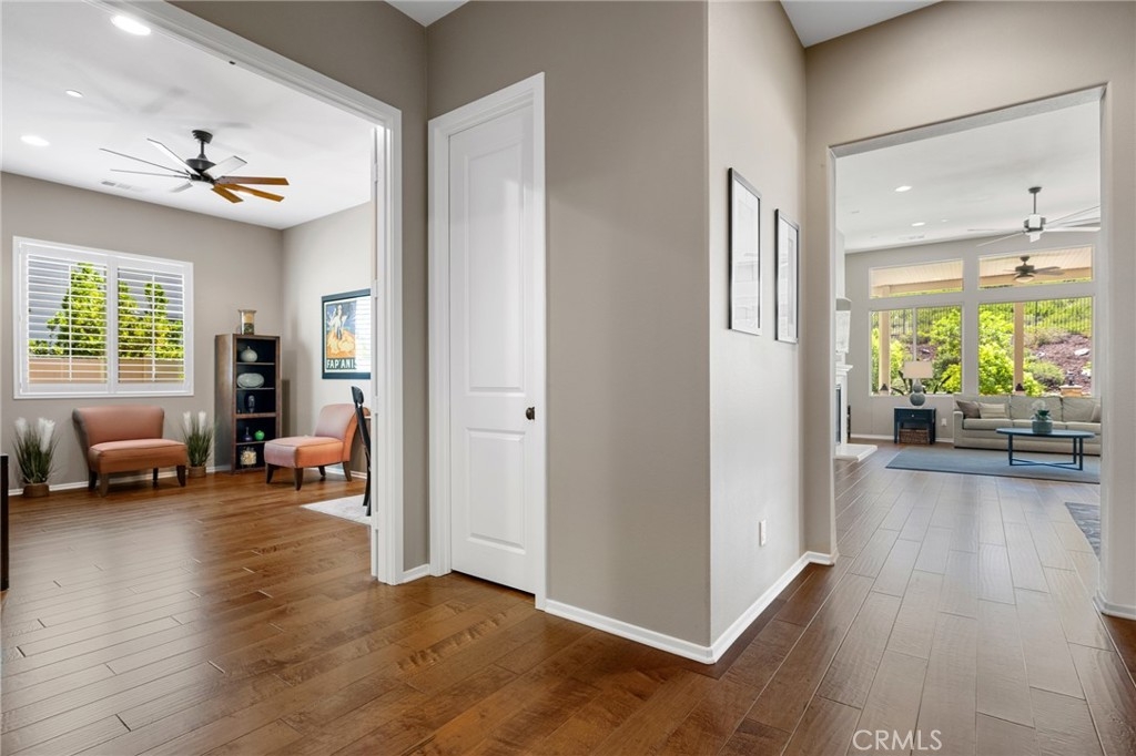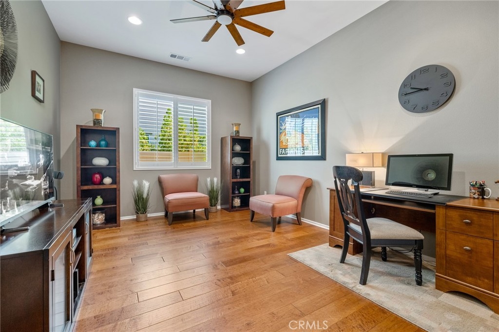 Accepting BACK UP OFFERS! Welcome home to the most stunning SINGLE STORY 3 bedroom, 3 bath with an OFFICE, in the prestigious community of Audie Murphy Ranch, Menifee. You are greeted by gorgeous landscaping featuring turf, mature trees, plants, river rock and serene water fountains. The 3 car tandem epoxy floored garage features a custom "Lifestyle" screen on the front of the garage, which allows walk-through access, privacy and a breeze to come through. As you enter the home you are greeted by REAL WOOD floors, tall ceilings, recessed lighting, custom paint, and plantation shutters throughout. The floor plan starts with an oversized bedroom right off the front with an attached jack & jill bath with marble counters with tile backsplash, tile floors, shower/tub combo attached to the 2nd bedroom, oversized as well, featuring a walk-in closet. The 3rd large room is currently being used as an office and boasts french doors but can easily have a closet added to be a true 4th bedroom with a half bath with tile floors that has room for a shower right off the walk-way. The Great Room boasts large windows allowing natural light to flood the home, a gas fireplace with mantel, wired for surround sound, custom ceiling fan and is open to the large dining room that is perfect for a flex space and is open to the gourmet kitchen. The kitchen is upgraded with quartz counters, an eat-up bar, 5 burner stove, stainless steel appliances, custom tile backsplash, white soft close cabinets, tons of storage, fluorescent under cabinet lights, & pendant lighting. The large walk-in pantry leads the way to the spacious laundry room featuring tile floors, storage, plumbed for a sink and access to the garage. The Master suite is off the great room appointed with big windows and plantation shutters with views of the yard, an attached bath with tile floors, dual vanity, Caesar stone counters, soaking tub, standing shower and giant walk-in closet. The private oasis of a yard is beautifully landscaped with stamped concrete, creating many different entertaining areas, large alumawood patio cover, gorgeous plants that line the yard with unobstructed mountain views, lush grass, & no rear neighbors. The Community has pools, spas, sport courts, hiking and biking trails, clubhouse, skate park, is in the Menifee USD with Taawila ES half a block away, the new middle school across the street, close to shopping & 15 and 215 freeways