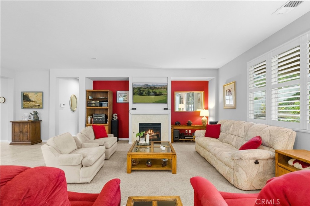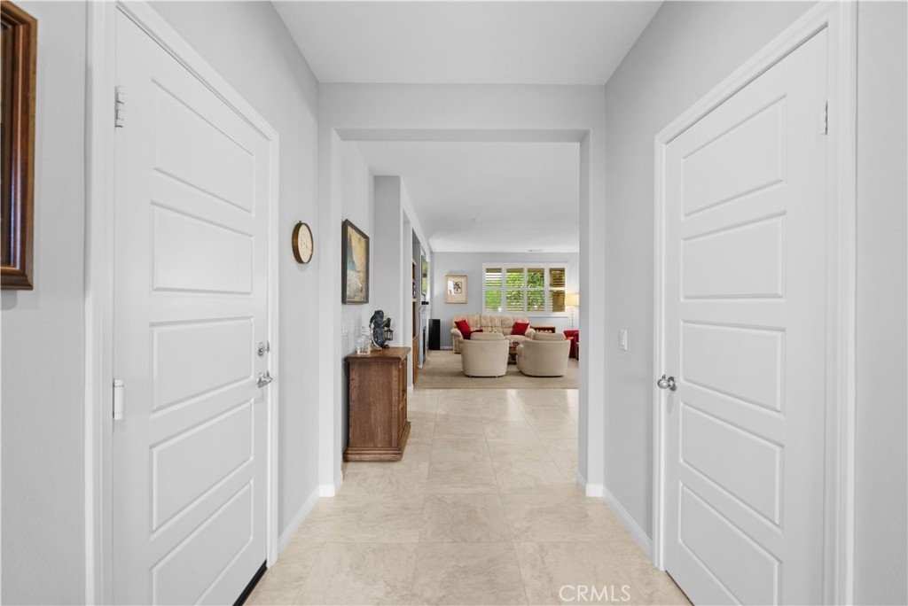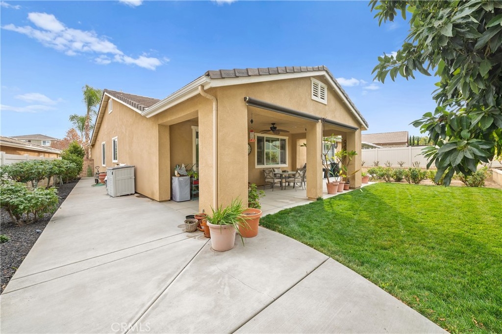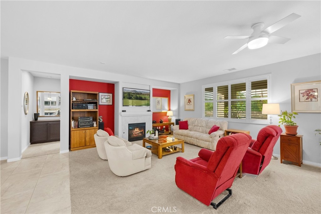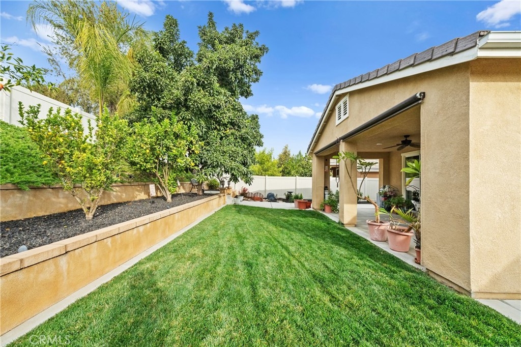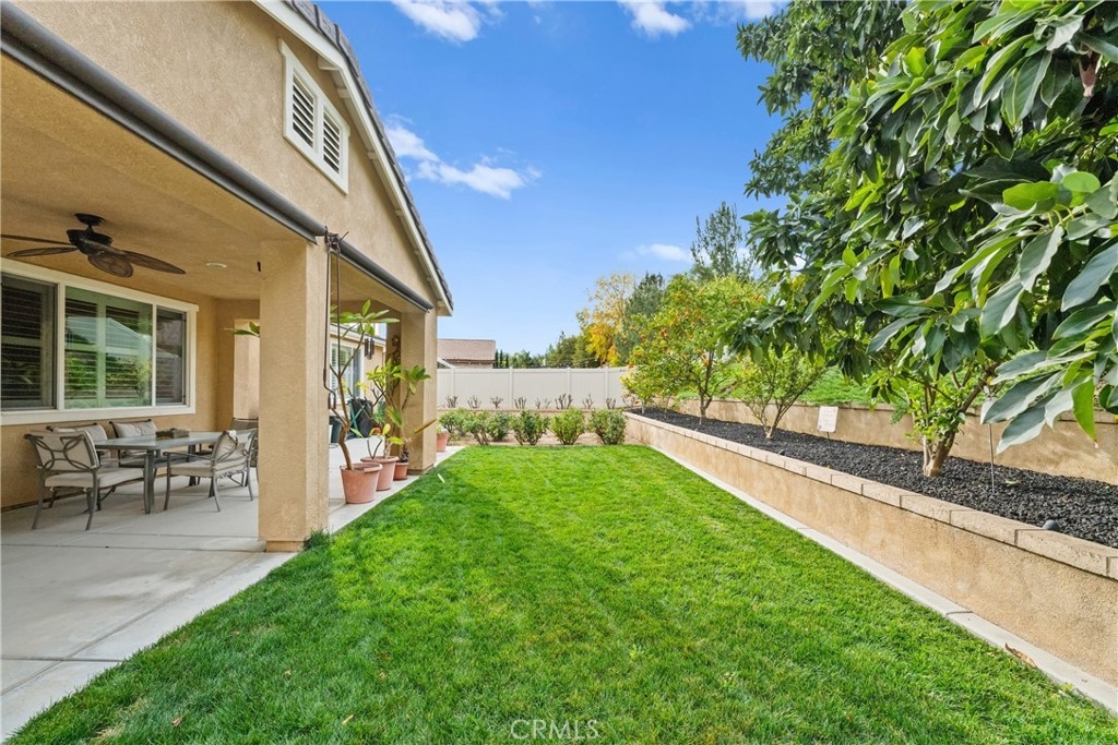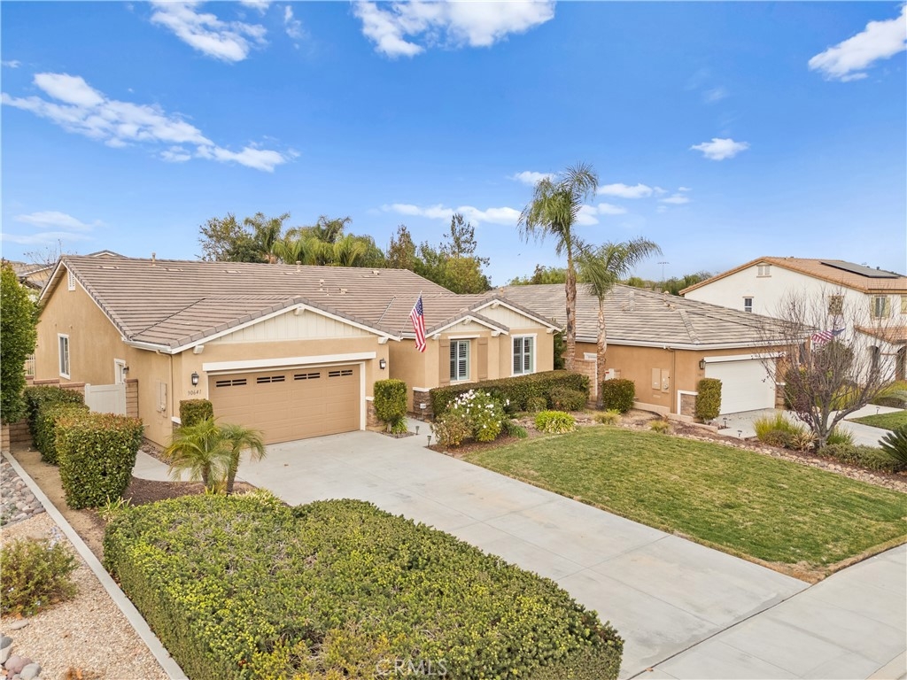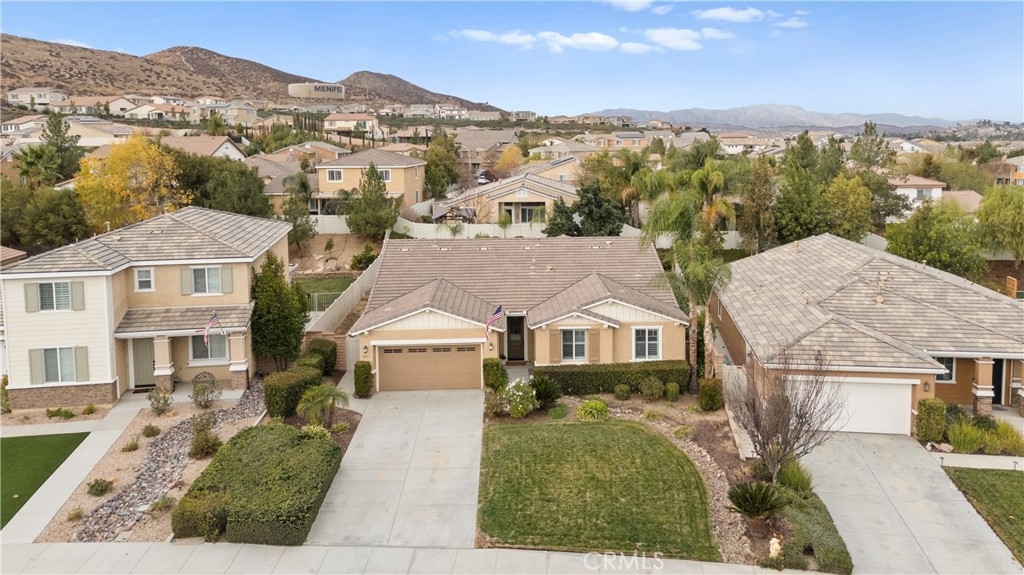 Welcome to one of the most desirable single-level homes in Menifee's coveted Audie Murphy Ranch. This exquisite 2,323 square-foot home offers three bedrooms, plus an office (Could be used as a fourth bedroom), and a blend of elegance and comfort, with every detail thoughtfully designed for modern living. Step through the stunning upgraded front door into an expansive, open hallway with elegant high ceilings, tile floors, a cozy fireplace, and upgraded interior paint (Agreeable Gray). Throughout the home, you'll appreciate the timeless beauty of plantation shutters, which add both privacy and beauty. The heart of the home is the chef-inspired kitchen, featuring an oversized island with luxurious granite countertops, stainless steel appliances, newly installed microwave oven, and a convenient walk-in pantry. The "touch" kitchen faucet adds convenience and makes meal preparation even easier. Retreat to the private primary suite, which features a large walk-in closet and a serene bathroom with double sinks, a separate shower, and a soaking tub—the perfect place to unwind after a long day. This property gives you lots of space with a sprawling lot of over 10,000 square feet, has a long driveway with plenty of guest parking, is located on a single-loaded street, is an outdoor sanctuary with lush mature fruit trees (including citrus, avocado, and peach), and vibrant roses that enhance the beauty of the backyard, and a “California Room” with roll-down screens that create a peaceful oasis perfect for gardening enthusiasts or simply relaxing in the tranquility of your surroundings. The three-car tandem garage has ample space and a built-in workbench and cabinets with a new water heater. The separate laundry room has a sink for added convenience as well. Audie Murphy Ranch offers resort-style amenities, including pools, sports courts, scenic walking paths, and organized activities. Ideally situated between the 15 and 215 freeways, this home is perfect for commuters seeking both convenience and luxury. Don't miss your chance to experience this well-cared-for, stunning home in one of Menifee’s most desirable communities.