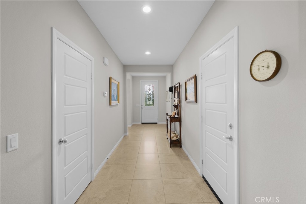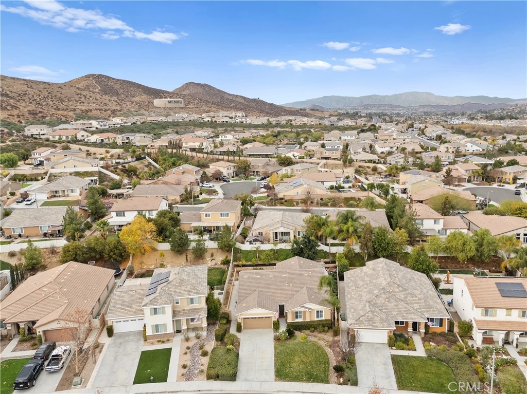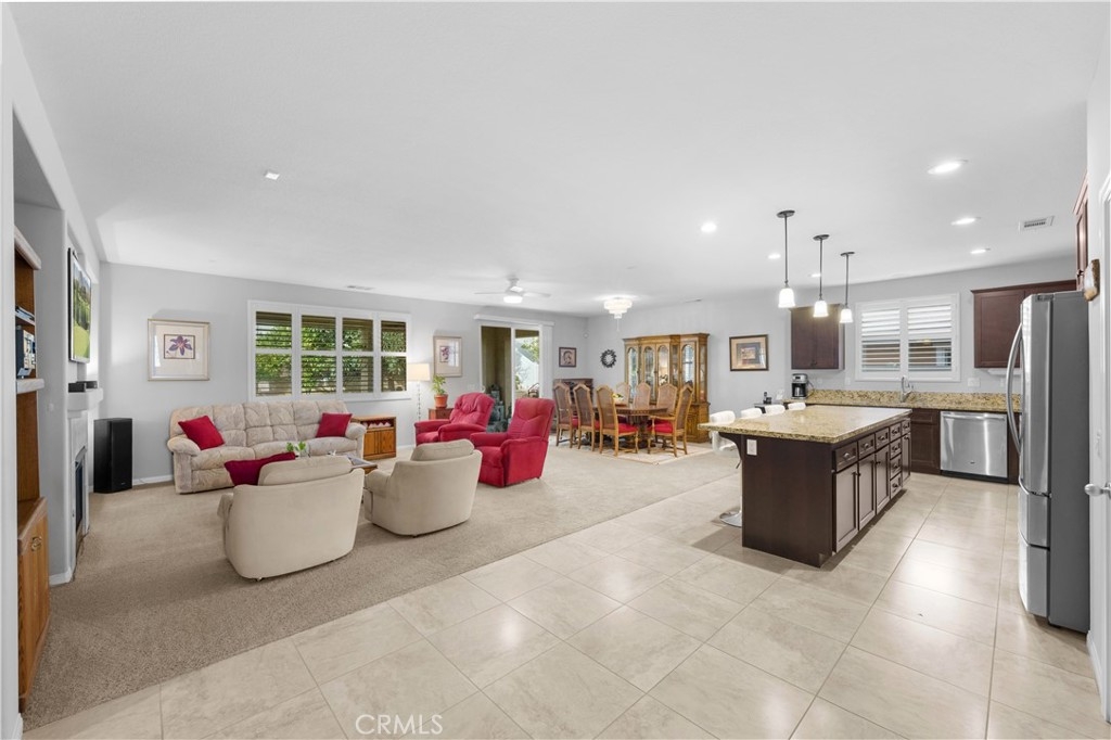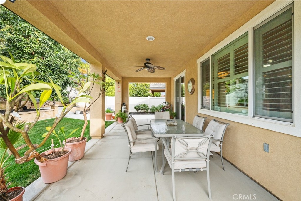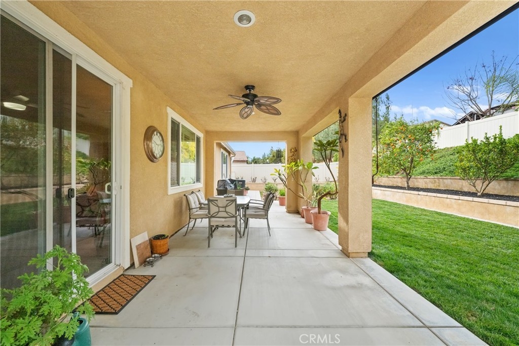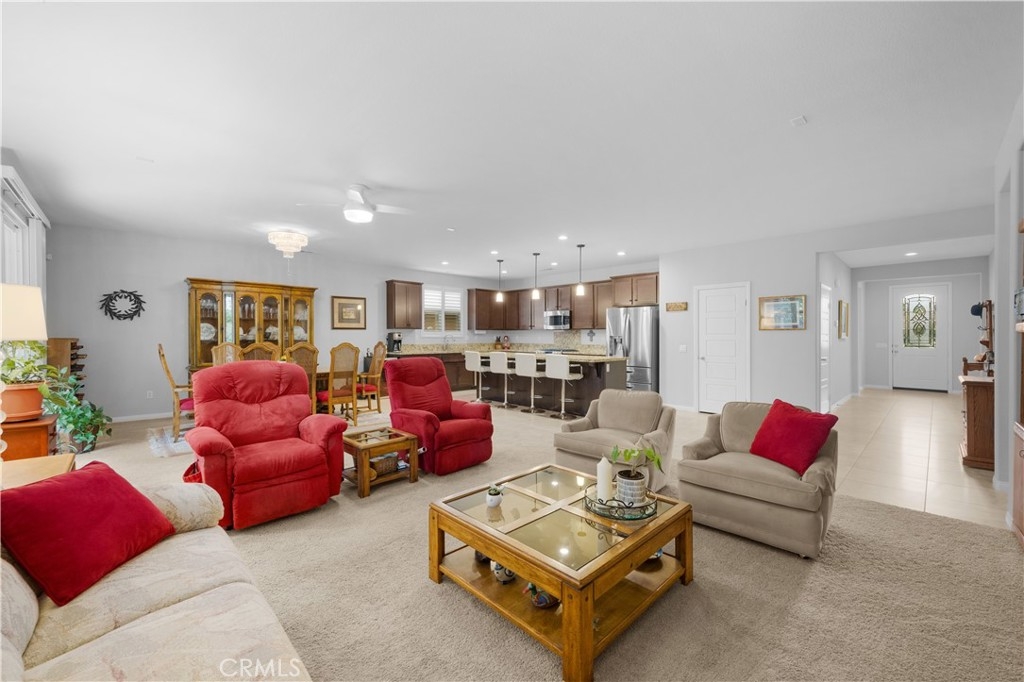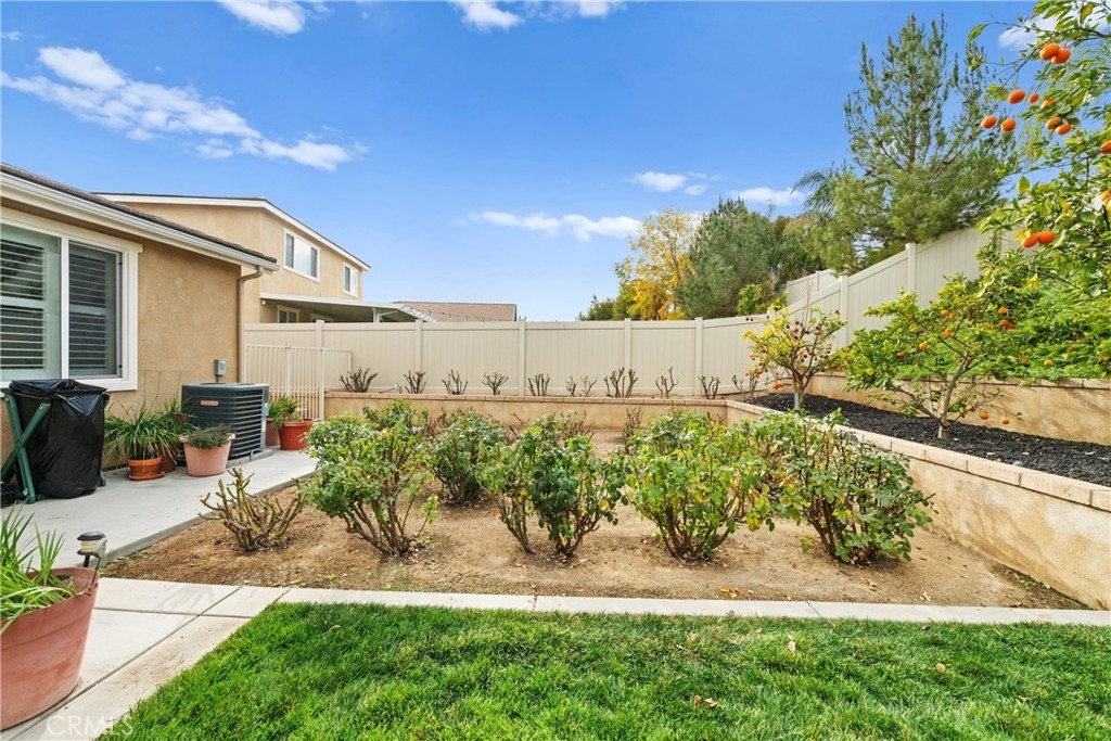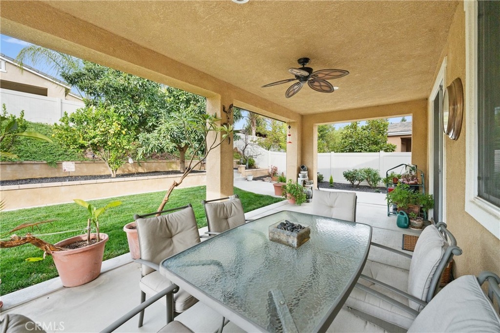Welcome to one of the most desirable single-level homes in Menifee's coveted Audie Murphy Ranch. This exquisite 2,323 square-foot home offers three bedrooms, plus an office (Could be used as a fourth bedroom), and a blend of elegance and comfort, with every detail thoughtfully designed for modern living. Step through the stunning upgraded front door into an expansive, open hallway with elegant high ceilings, tile floors, a cozy fireplace, and upgraded interior paint (Agreeable Gray). Throughout the home, you'll appreciate the timeless beauty of plantation shutters, which add both privacy and beauty. The heart of the home is the chef-inspired kitchen, featuring an oversized island with luxurious granite countertops, stainless steel appliances, newly installed microwave oven, and a convenient walk-in pantry. The "touch" kitchen faucet adds convenience and makes meal preparation even easier. Retreat to the private primary suite, which features a large walk-in closet and a serene bathroom with double sinks, a separate shower, and a soaking tub—the perfect place to unwind after a long day. This property gives you lots of space with a sprawling lot of over 10,000 square feet, has a long driveway with plenty of guest parking, is located on a single-loaded street, is an outdoor sanctuary with lush mature fruit trees (including citrus, avocado, and peach), and vibrant roses that enhance the beauty of the backyard, and a “California Room” with roll-down screens that create a peaceful oasis perfect for gardening enthusiasts or simply relaxing in the tranquility of your surroundings. The three-car tandem garage has ample space and a built-in workbench and cabinets with a new water heater. The separate laundry room has a sink for added convenience as well. Audie Murphy Ranch offers resort-style amenities, including pools, sports courts, scenic walking paths, and organized activities. Ideally situated between the 15 and 215 freeways, this home is perfect for commuters seeking both convenience and luxury. Don't miss your chance to experience this well-cared-for, stunning home in one of Menifee’s most desirable communities.