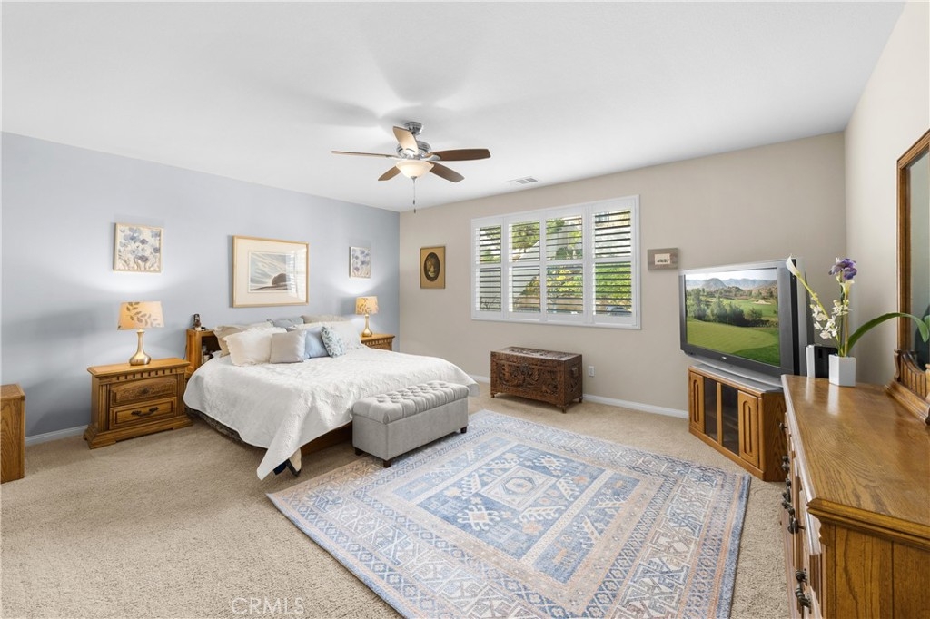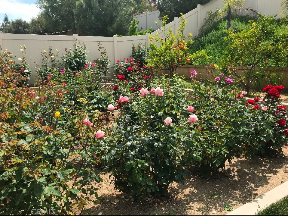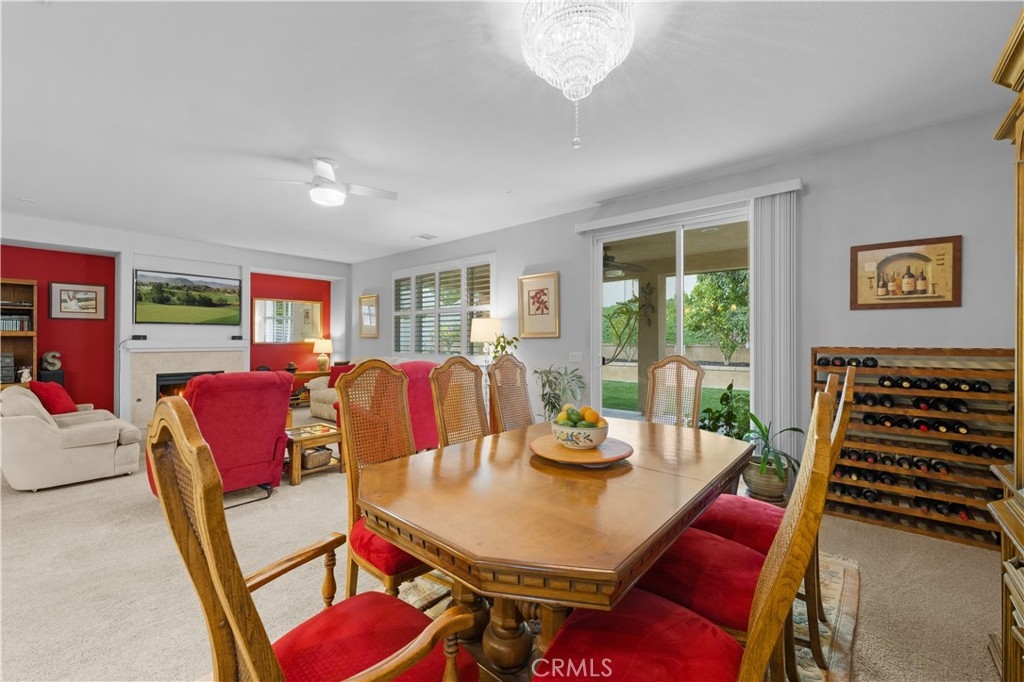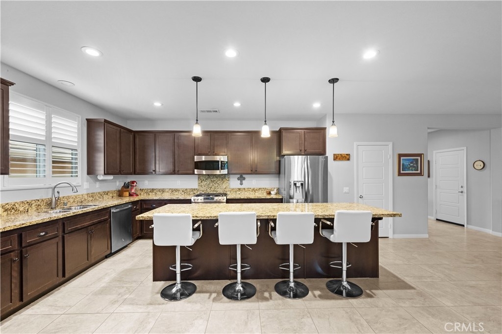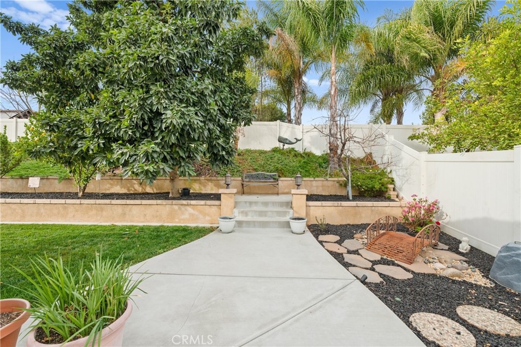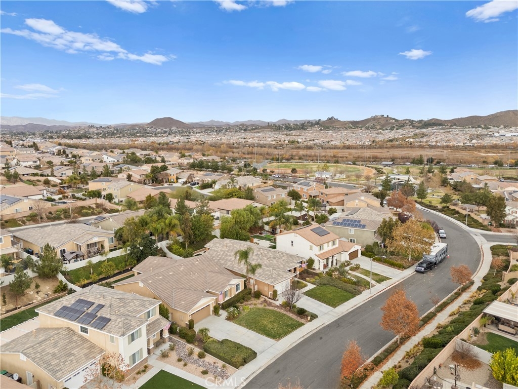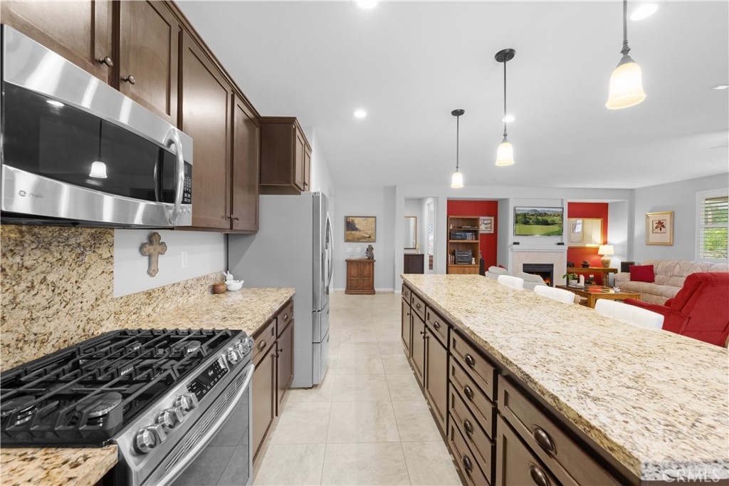 Welcome to one of the most desirable single-level homes in Menifee's coveted Audie Murphy Ranch. This exquisite 2,323 square-foot home offers three bedrooms, plus an office (Could be used as a fourth bedroom), and a blend of elegance and comfort, with every detail thoughtfully designed for modern living. Step through the stunning upgraded front door into an expansive, open hallway with elegant high ceilings, tile floors, a cozy fireplace, and upgraded interior paint (Agreeable Gray). Throughout the home, you'll appreciate the timeless beauty of plantation shutters, which add both privacy and beauty. The heart of the home is the chef-inspired kitchen, featuring an oversized island with luxurious granite countertops, stainless steel appliances, newly installed microwave oven, and a convenient walk-in pantry. The "touch" kitchen faucet adds convenience and makes meal preparation even easier. Retreat to the private primary suite, which features a large walk-in closet and a serene bathroom with double sinks, a separate shower, and a soaking tub—the perfect place to unwind after a long day. This property gives you lots of space with a sprawling lot of over 10,000 square feet, has a long driveway with plenty of guest parking, is located on a single-loaded street, is an outdoor sanctuary with lush mature fruit trees (including citrus, avocado, and peach), and vibrant roses that enhance the beauty of the backyard, and a “California Room” with roll-down screens that create a peaceful oasis perfect for gardening enthusiasts or simply relaxing in the tranquility of your surroundings. The three-car tandem garage has ample space and a built-in workbench and cabinets with a new water heater. The separate laundry room has a sink for added convenience as well. Audie Murphy Ranch offers resort-style amenities, including pools, sports courts, scenic walking paths, and organized activities. Ideally situated between the 15 and 215 freeways, this home is perfect for commuters seeking both convenience and luxury. Don't miss your chance to experience this well-cared-for, stunning home in one of Menifee’s most desirable communities.