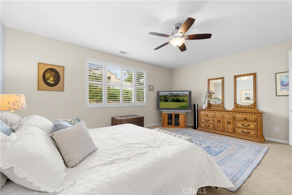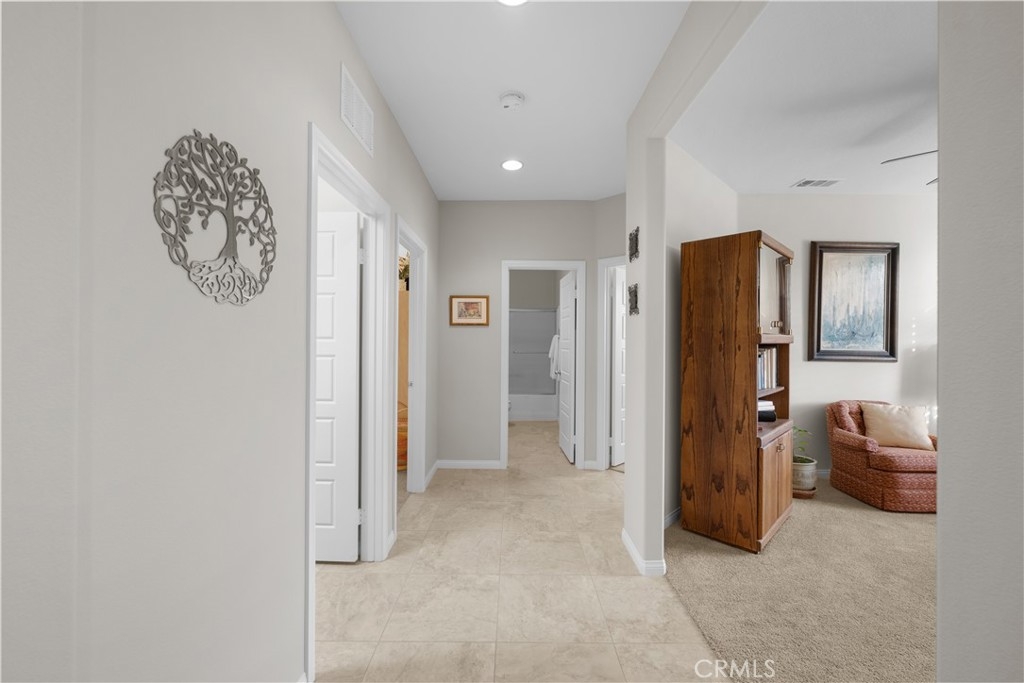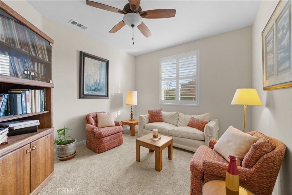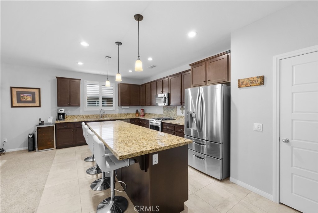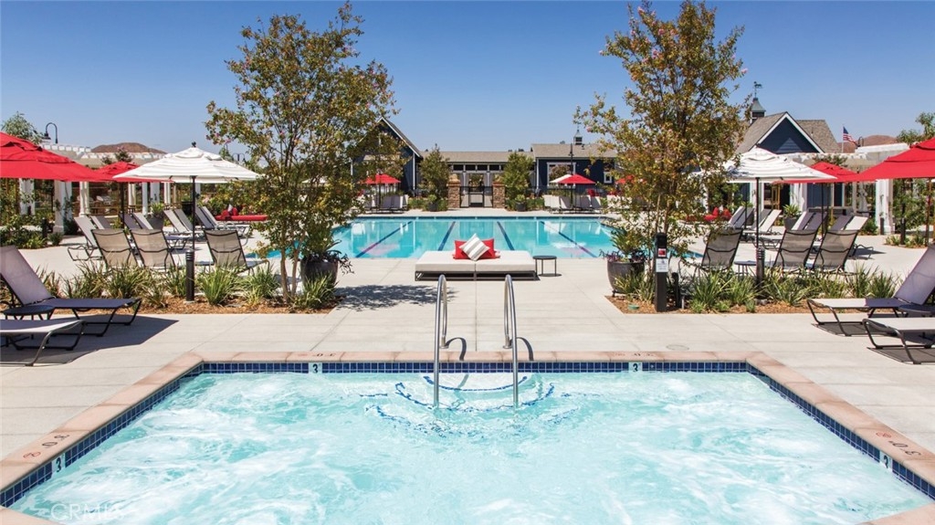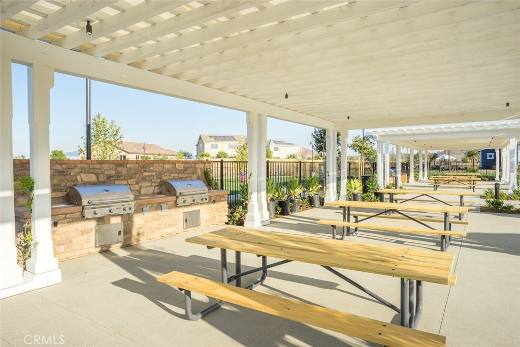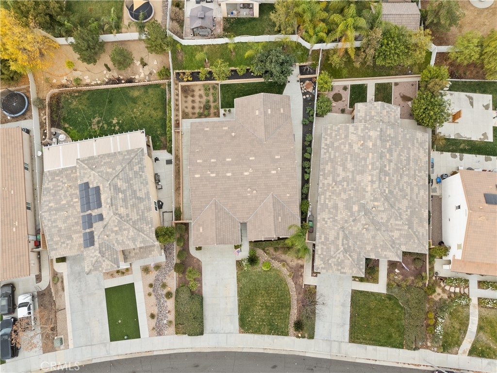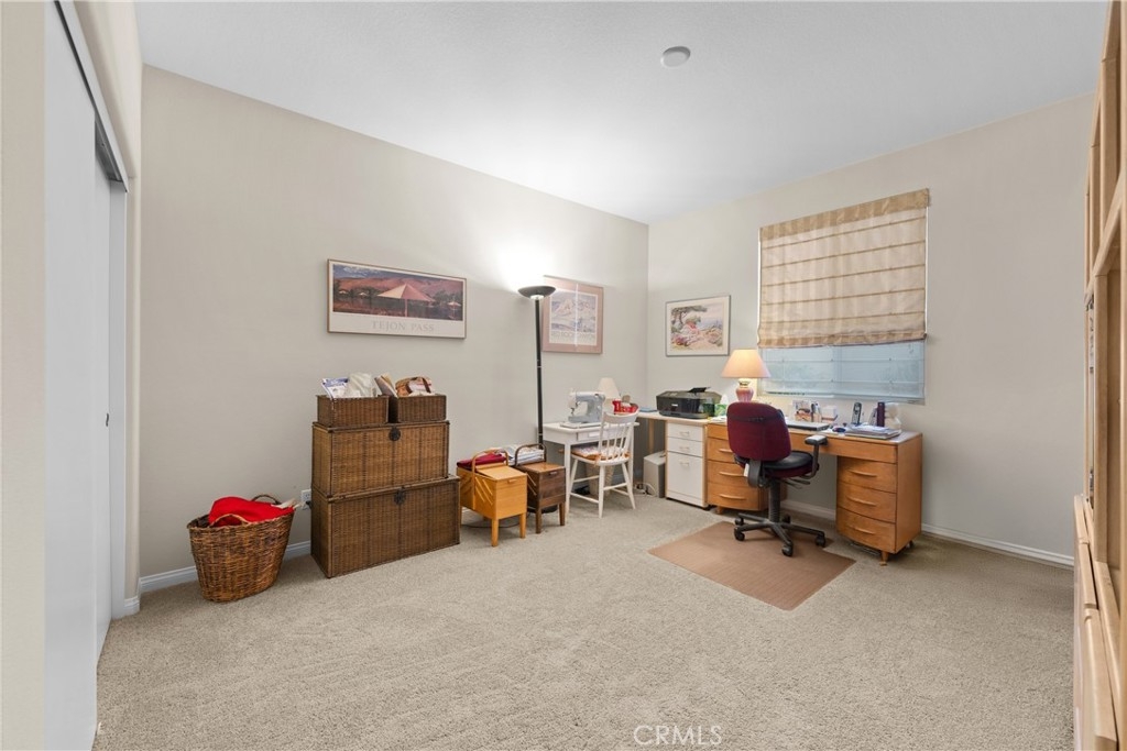 Welcome to one of the most desirable single-level homes in Menifee's coveted Audie Murphy Ranch. This exquisite 2,323 square-foot home offers three bedrooms, plus an office (Could be used as a fourth bedroom), and a blend of elegance and comfort, with every detail thoughtfully designed for modern living. Step through the stunning upgraded front door into an expansive, open hallway with elegant high ceilings, tile floors, a cozy fireplace, and upgraded interior paint (Agreeable Gray). Throughout the home, you'll appreciate the timeless beauty of plantation shutters, which add both privacy and beauty. The heart of the home is the chef-inspired kitchen, featuring an oversized island with luxurious granite countertops, stainless steel appliances, newly installed microwave oven, and a convenient walk-in pantry. The "touch" kitchen faucet adds convenience and makes meal preparation even easier. Retreat to the private primary suite, which features a large walk-in closet and a serene bathroom with double sinks, a separate shower, and a soaking tub—the perfect place to unwind after a long day. This property gives you lots of space with a sprawling lot of over 10,000 square feet, has a long driveway with plenty of guest parking, is located on a single-loaded street, is an outdoor sanctuary with lush mature fruit trees (including citrus, avocado, and peach), and vibrant roses that enhance the beauty of the backyard, and a “California Room” with roll-down screens that create a peaceful oasis perfect for gardening enthusiasts or simply relaxing in the tranquility of your surroundings. The three-car tandem garage has ample space and a built-in workbench and cabinets with a new water heater. The separate laundry room has a sink for added convenience as well. Audie Murphy Ranch offers resort-style amenities, including pools, sports courts, scenic walking paths, and organized activities. Ideally situated between the 15 and 215 freeways, this home is perfect for commuters seeking both convenience and luxury. Don't miss your chance to experience this well-cared-for, stunning home in one of Menifee’s most desirable communities.