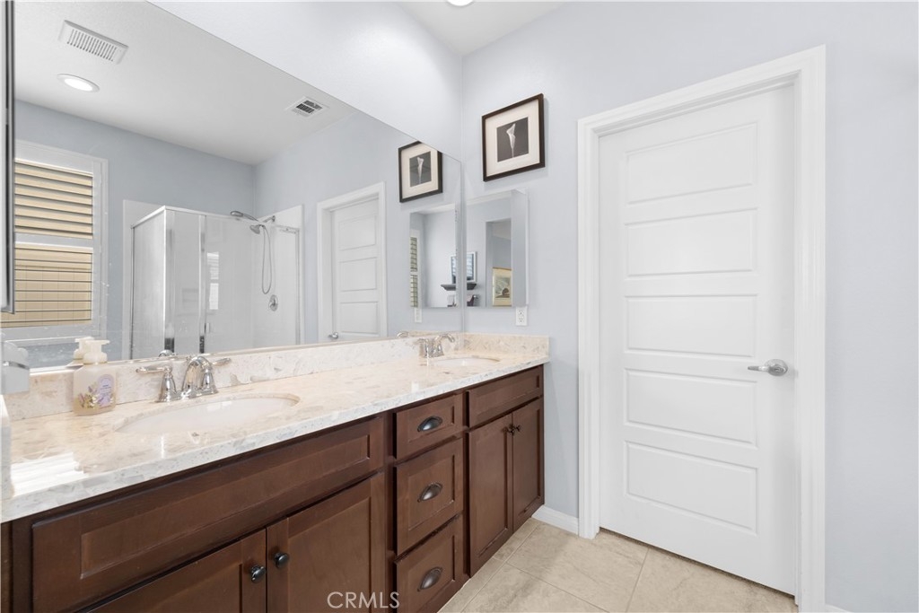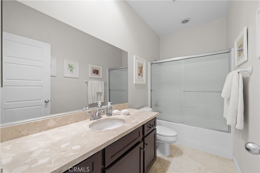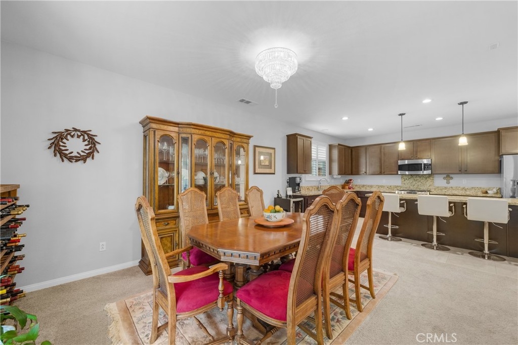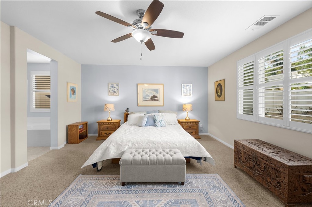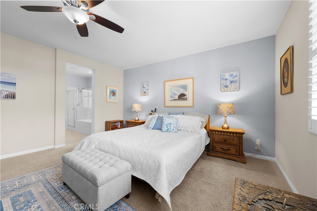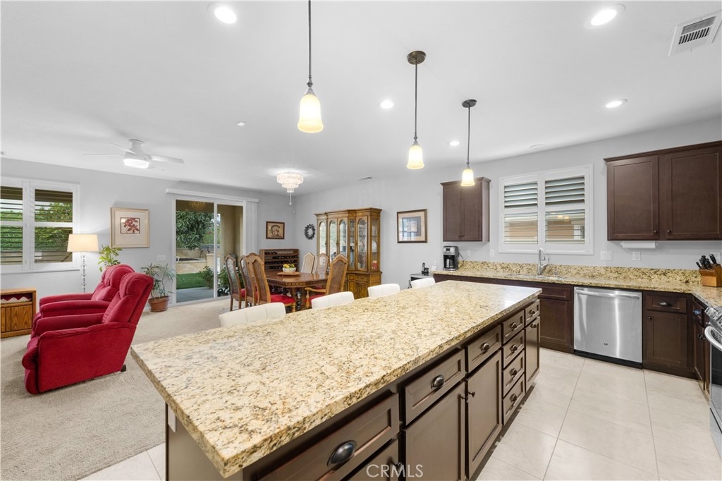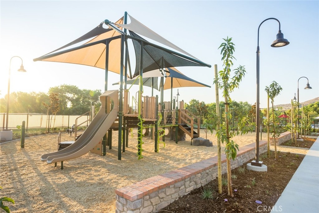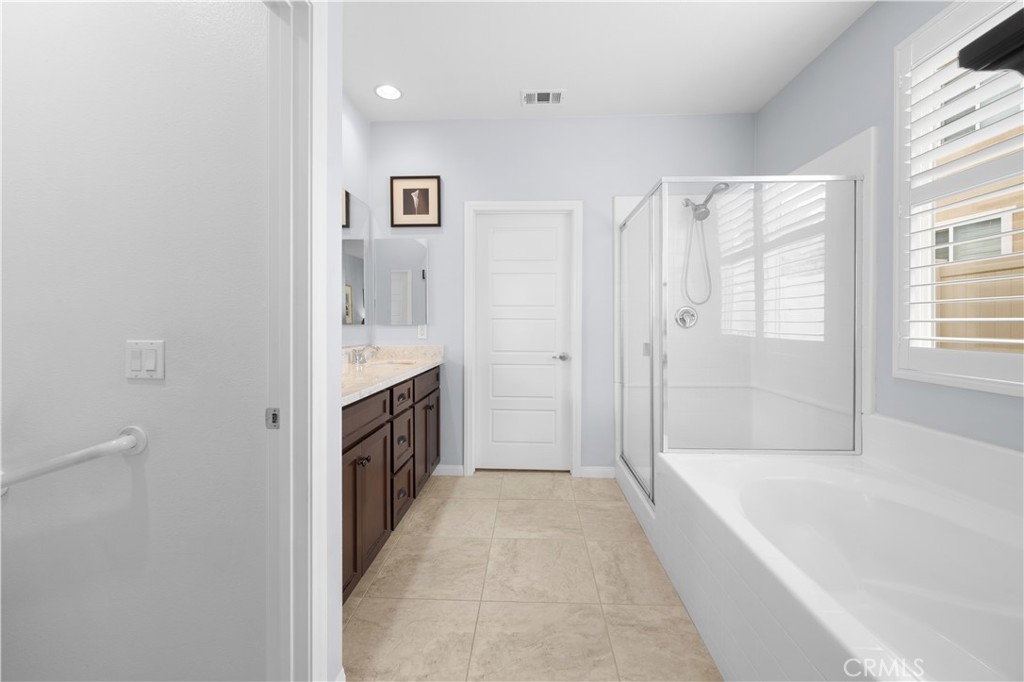 Welcome to one of the most desirable single-level homes in Menifee's coveted Audie Murphy Ranch. This exquisite 2,323 square-foot home offers three bedrooms, plus an office (Could be used as a fourth bedroom), and a blend of elegance and comfort, with every detail thoughtfully designed for modern living. Step through the stunning upgraded front door into an expansive, open hallway with elegant high ceilings, tile floors, a cozy fireplace, and upgraded interior paint (Agreeable Gray). Throughout the home, you'll appreciate the timeless beauty of plantation shutters, which add both privacy and beauty. The heart of the home is the chef-inspired kitchen, featuring an oversized island with luxurious granite countertops, stainless steel appliances, newly installed microwave oven, and a convenient walk-in pantry. The "touch" kitchen faucet adds convenience and makes meal preparation even easier. Retreat to the private primary suite, which features a large walk-in closet and a serene bathroom with double sinks, a separate shower, and a soaking tub—the perfect place to unwind after a long day. This property gives you lots of space with a sprawling lot of over 10,000 square feet, has a long driveway with plenty of guest parking, is located on a single-loaded street, is an outdoor sanctuary with lush mature fruit trees (including citrus, avocado, and peach), and vibrant roses that enhance the beauty of the backyard, and a “California Room” with roll-down screens that create a peaceful oasis perfect for gardening enthusiasts or simply relaxing in the tranquility of your surroundings. The three-car tandem garage has ample space and a built-in workbench and cabinets with a new water heater. The separate laundry room has a sink for added convenience as well. Audie Murphy Ranch offers resort-style amenities, including pools, sports courts, scenic walking paths, and organized activities. Ideally situated between the 15 and 215 freeways, this home is perfect for commuters seeking both convenience and luxury. Don't miss your chance to experience this well-cared-for, stunning home in one of Menifee’s most desirable communities.
